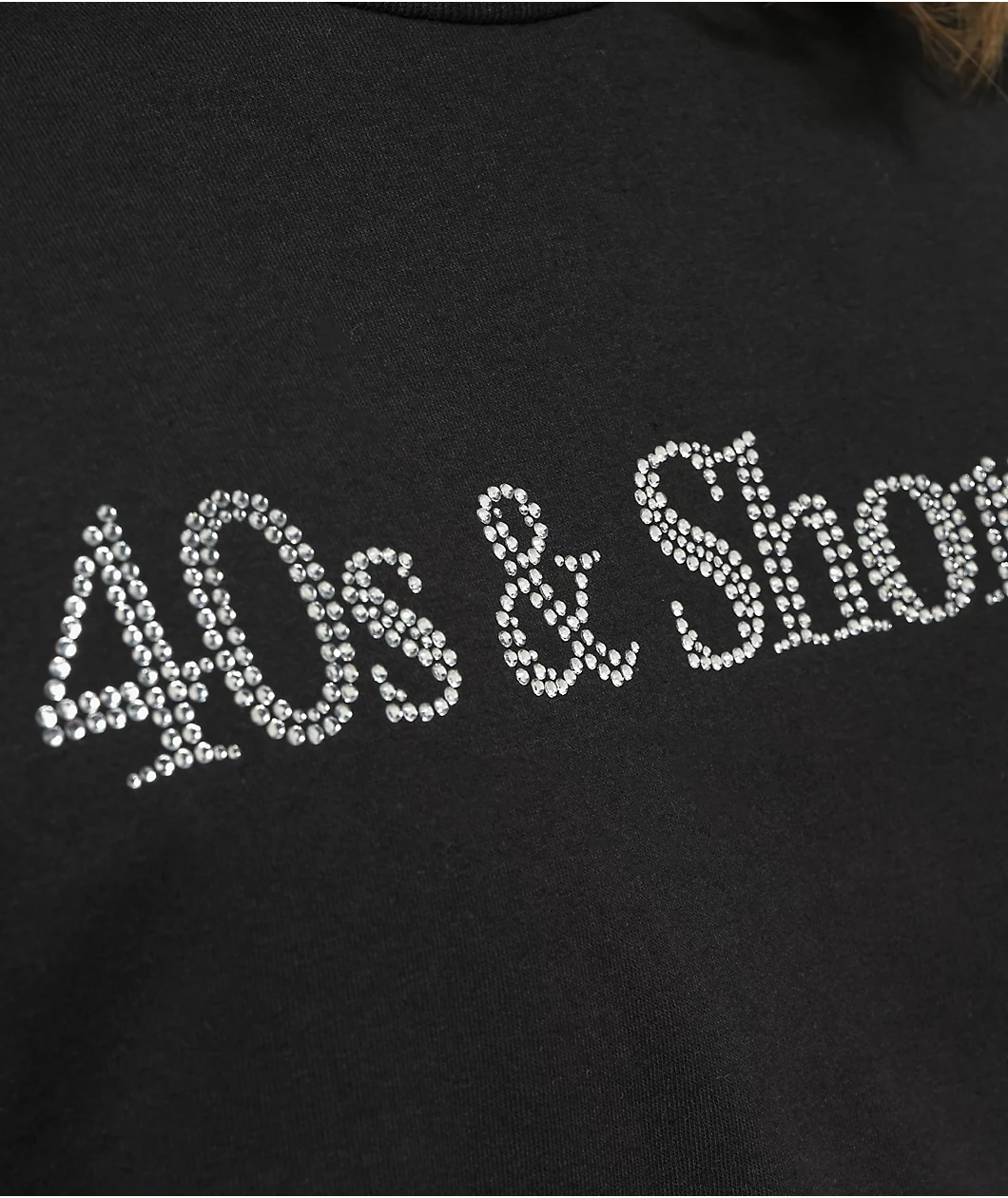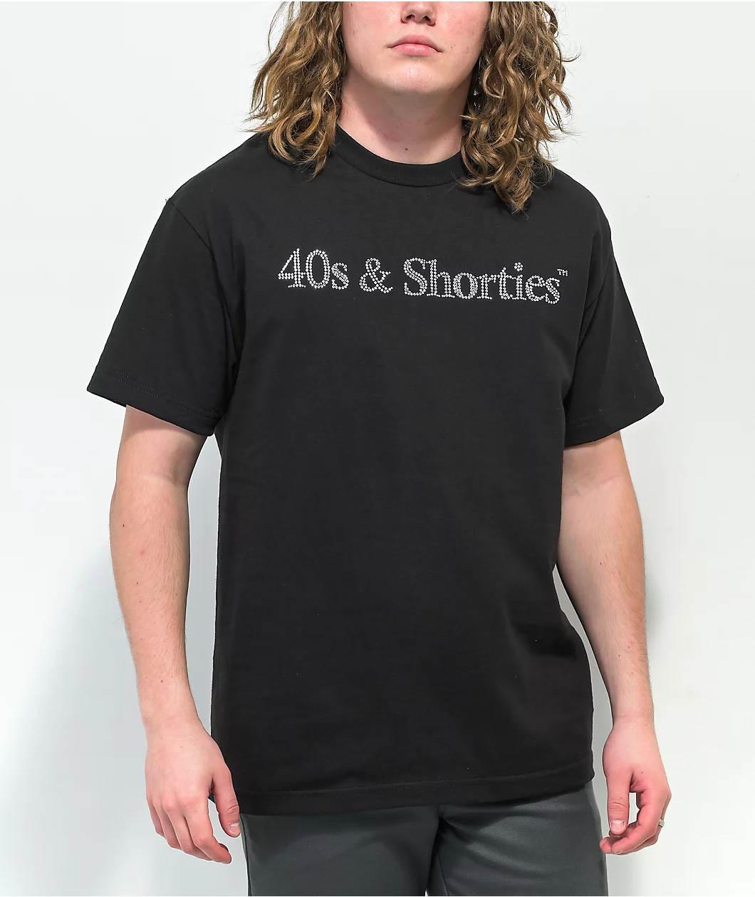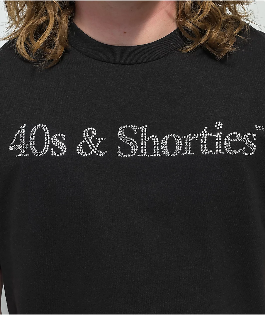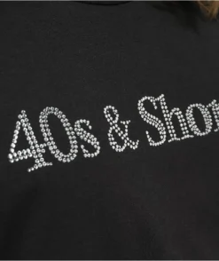 Embrace the casual yet elegant stylings of the Rhinestone Text t-shirt from 40s & Shorties. This tee comes in an easy-to-pair black colorway that’s accentuated by a rhinestone-studded 40s & Shorties script across the chest.