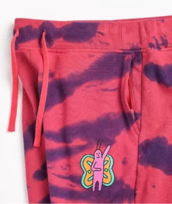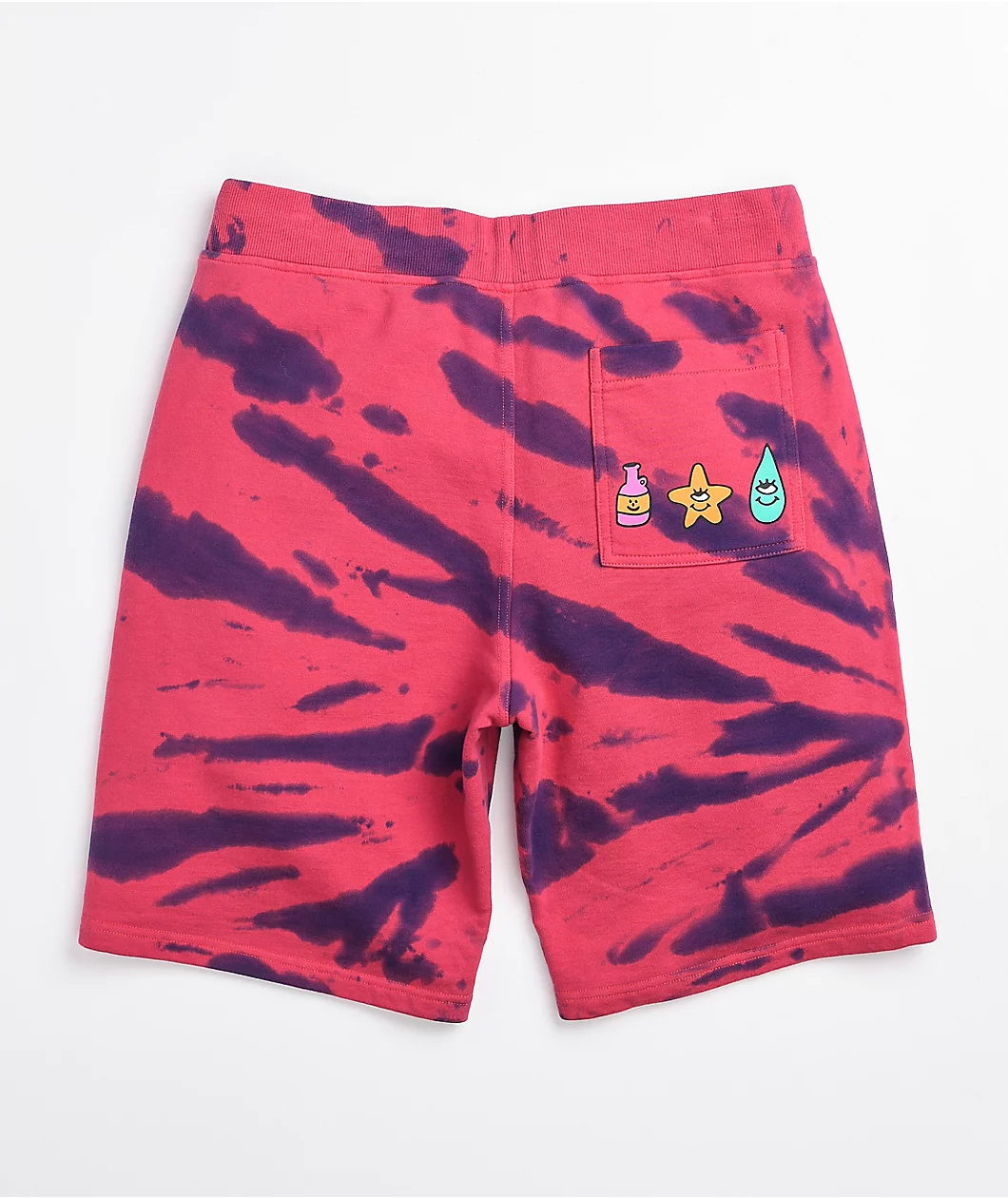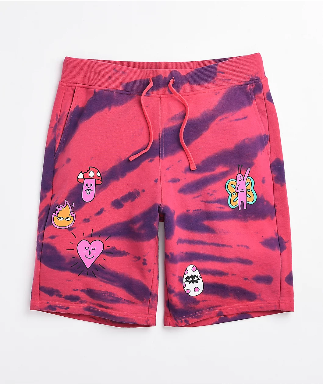 Kick some graphic style into your shorts collection with the Wavelength pink and blue tie dye sweat shorts from A-Lab! These bright pink sweat shorts feature blue tie dye stripes throughout for a unique, colorful style. The butterfly, mushroom, egg and heart characters throughout give these striking shorts a friendly vibe, making them welcome in any look.