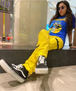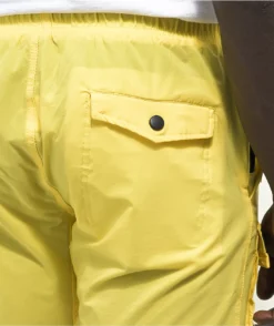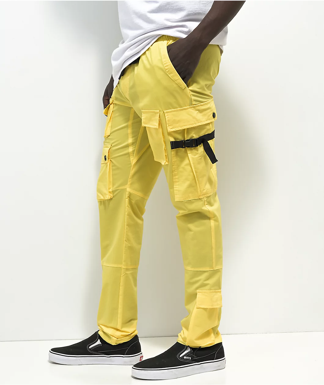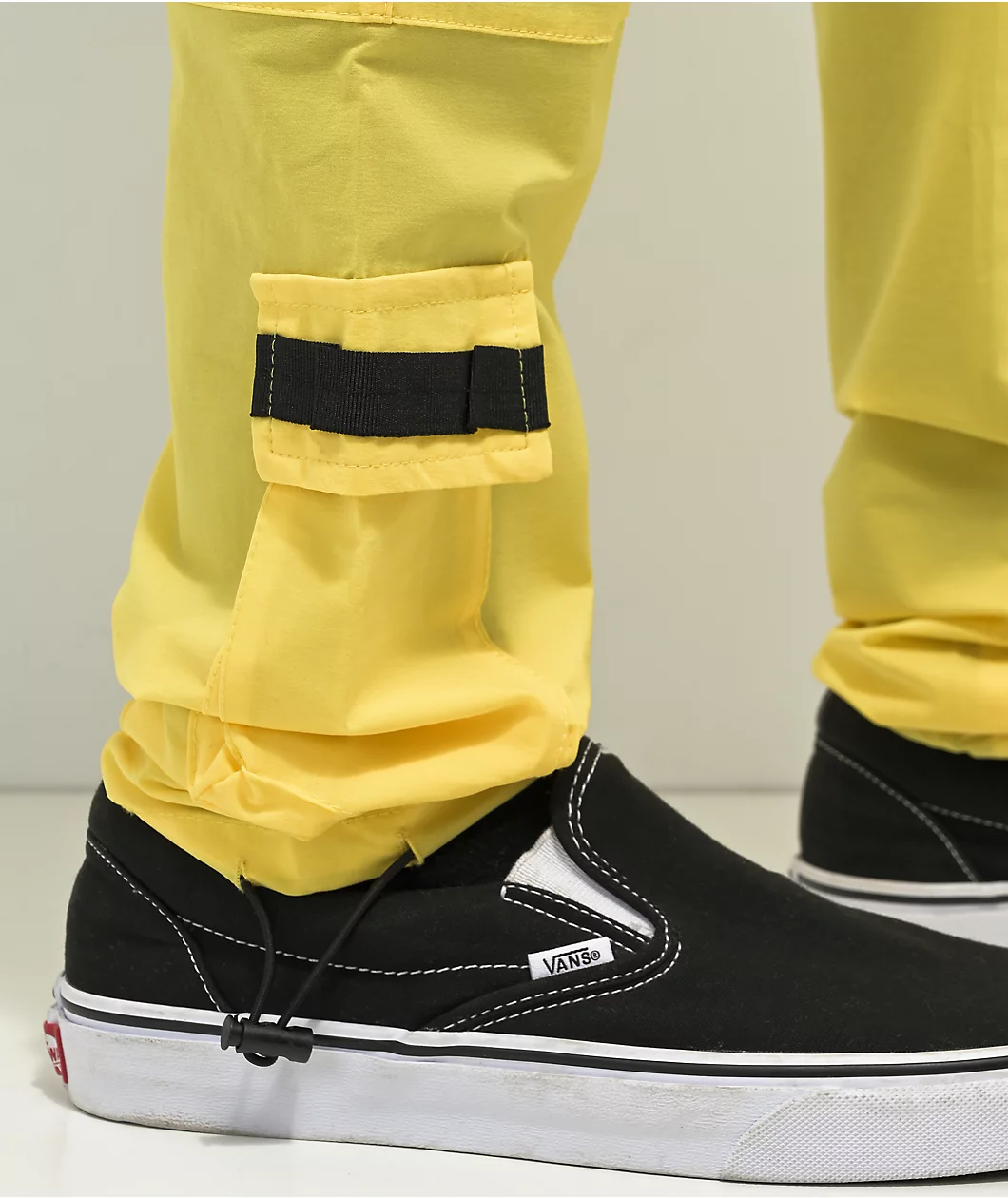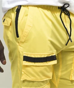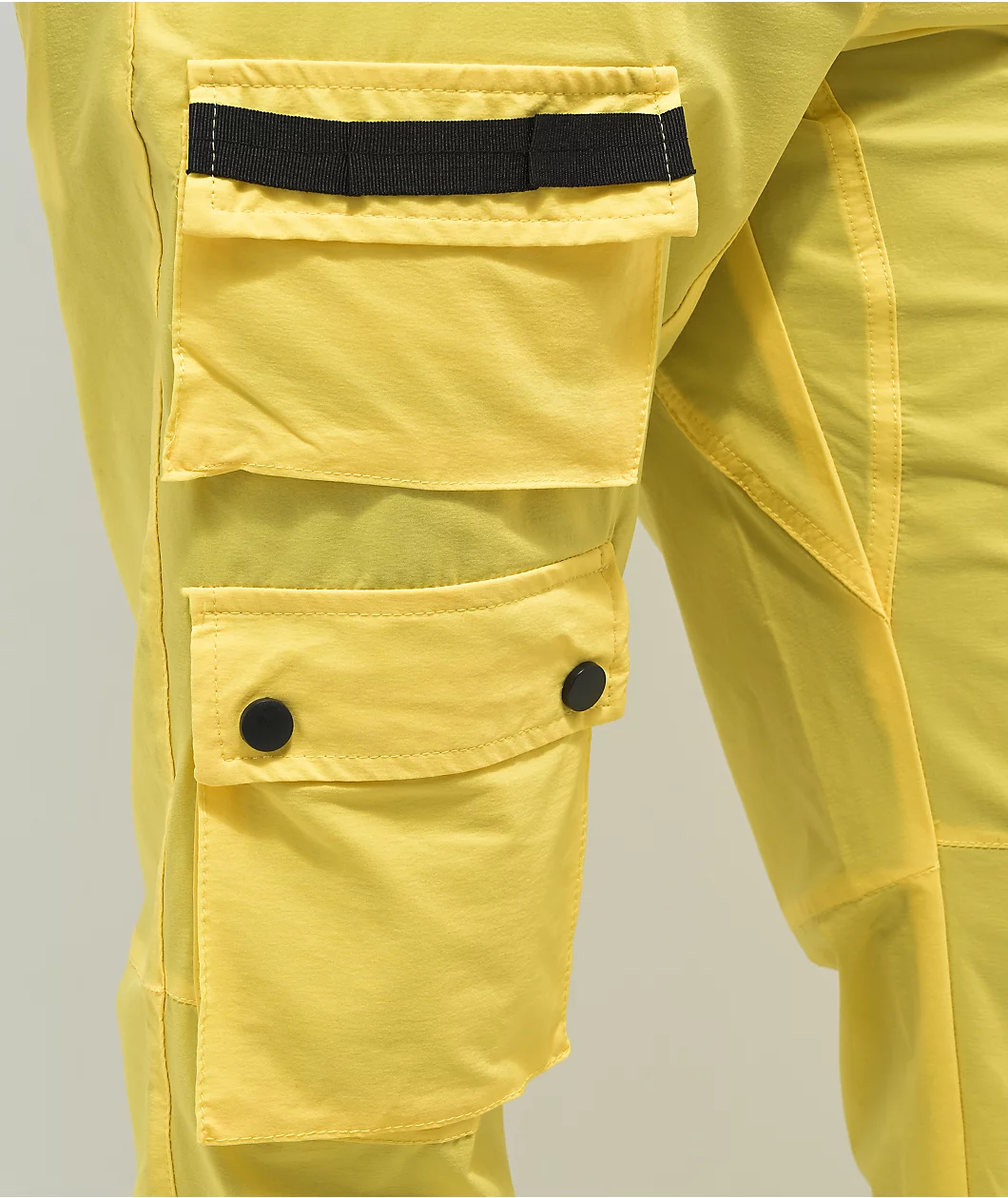 These American Stitch pants come in a striking canary yellow colorway, and have a flowy, lightweight nylon construction. Each leg is equipped with varying cargo pockets of both size and closure. These pants have a slim fit through the thigh to the ankle, and a comfortable, adjustable elastic waistband with custom aglets on the drawstring.