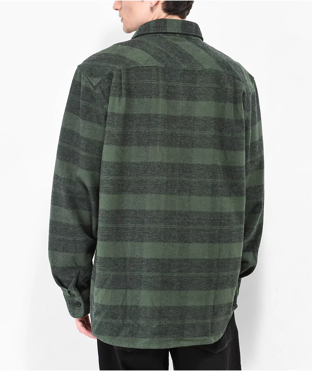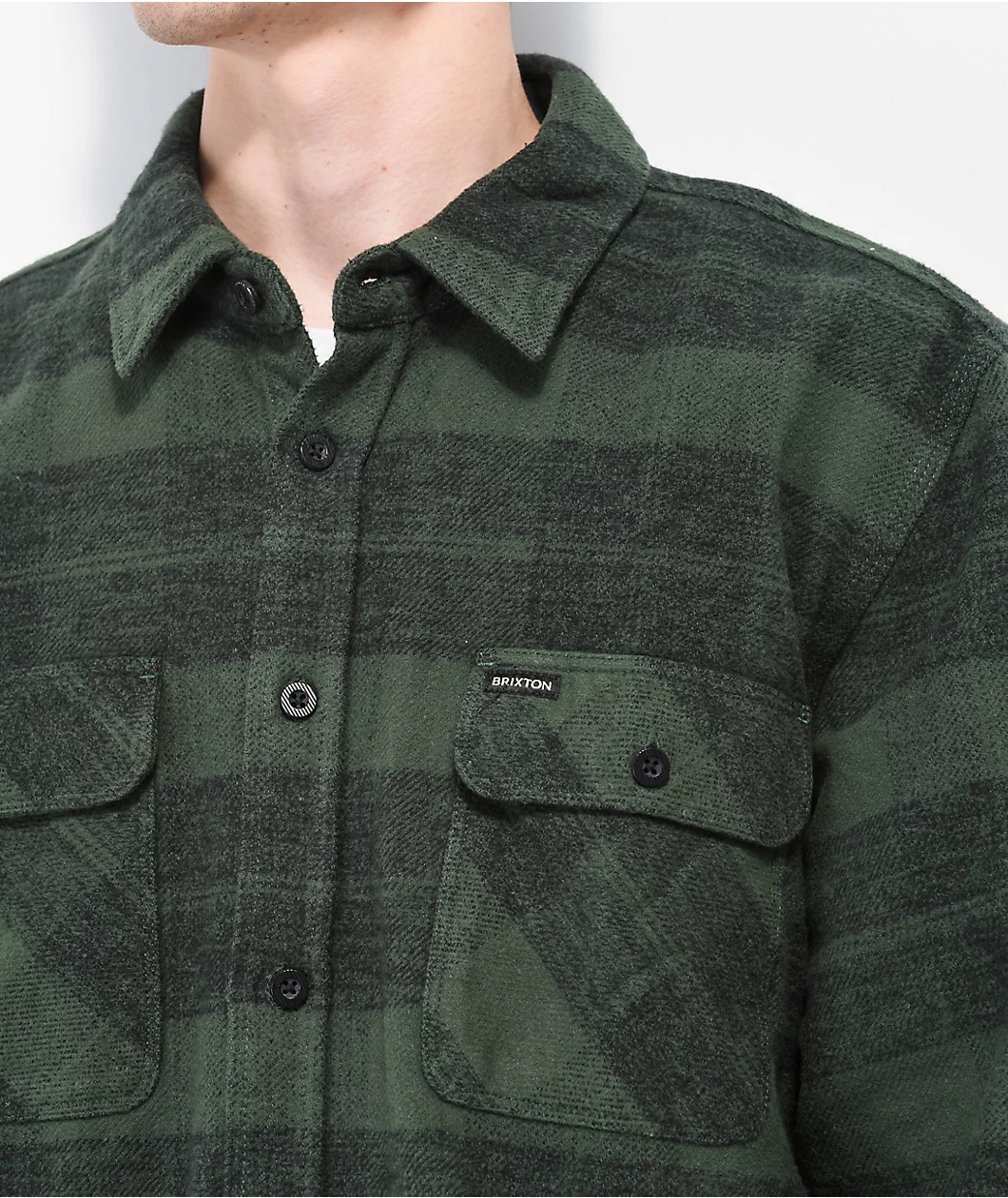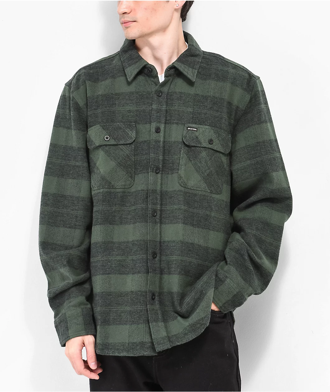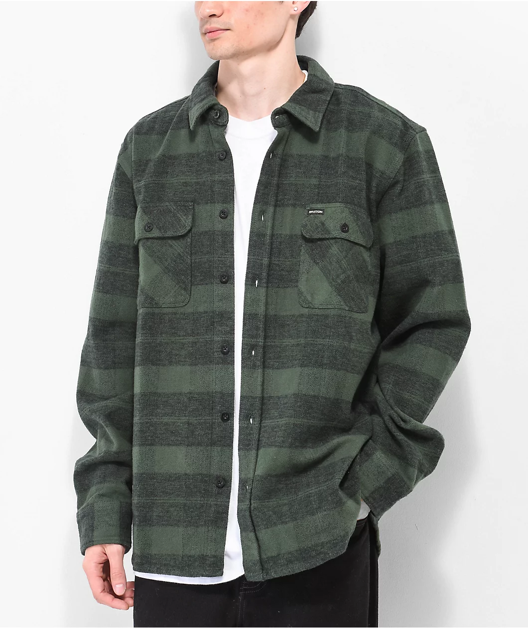 Brixton brings the Bowery heavy flannel shirt in a muted green colorway, displaying plaid patterning throughout. This heavyweight flannel features a full button closure for a versatile fit, and comes complete with a traditional turndown collar for a classic look.