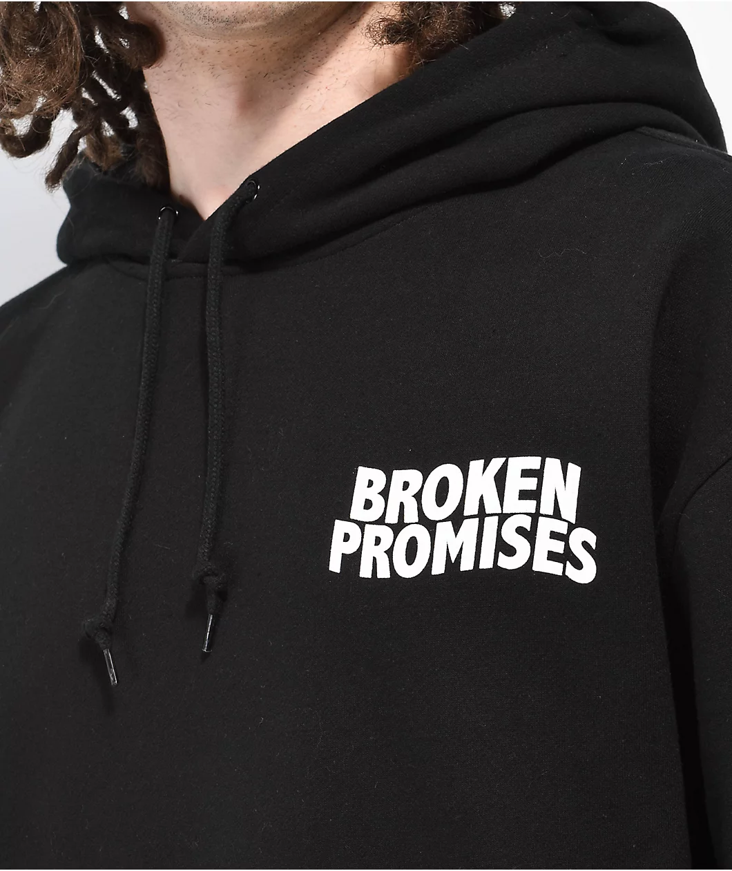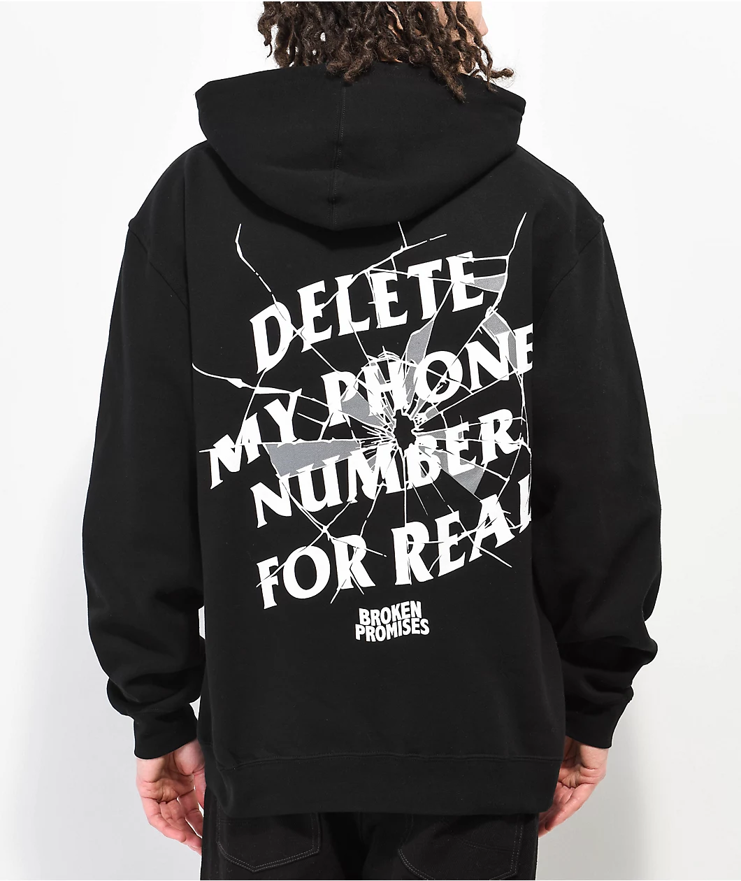 The Cracked Screen hoodie from Broken Promises comes in a black colorway with white brand script screen-printed on the left of chest while the back boasts script reading, “Delete my phone number for real” with a cracked glass overlay. This snarky hoodie has a classic pullover construction with a drawstring-adjustable hood and a kangaroo pouch pocket for any on hand goodies.