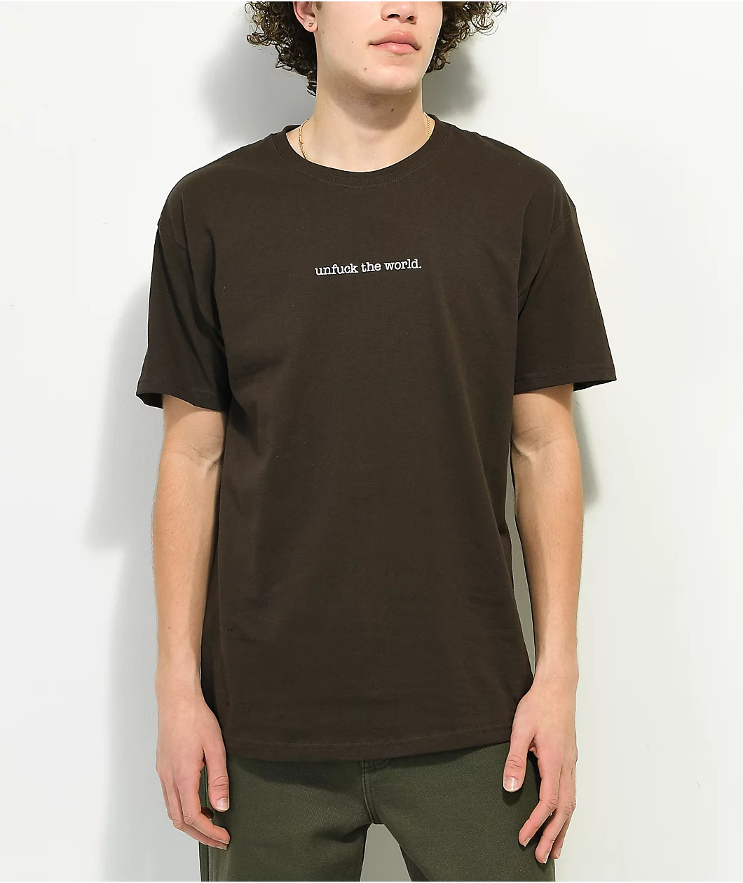 Plain and simple, the Unfuck The World t-shirt from Can’t Blame The Youth is made from soft, durable, midweight cotton, and comes in a dark brown colorway with “unfuck the world.” screen-printed across the chest in white.