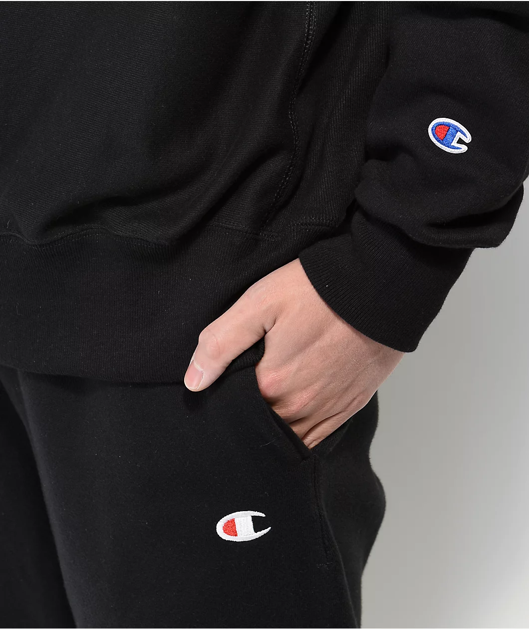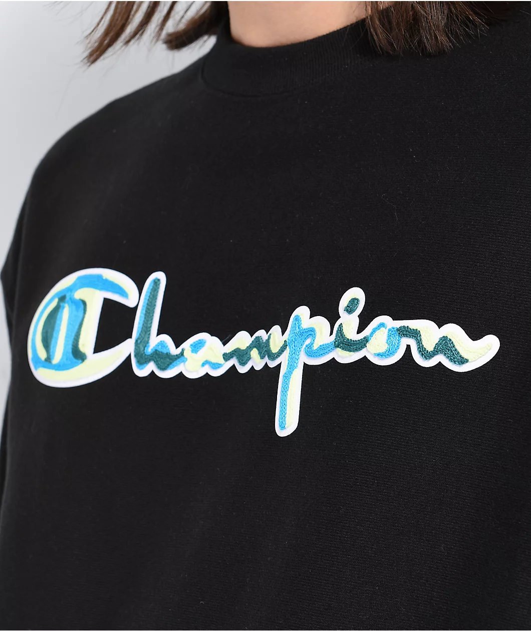 Coming in a black colorway, the Champion GF70 crewneck sweatshirt is made from premium reverse weave fabric. The chest features trippy chain-stitched Champion detailing, with light blie, green and yellow tones. Ribbed gussets along the sides add greater mobility, as the heavyweight cotton sweater is finished with a cozy brushed interior and a logo applique on the left wrist.