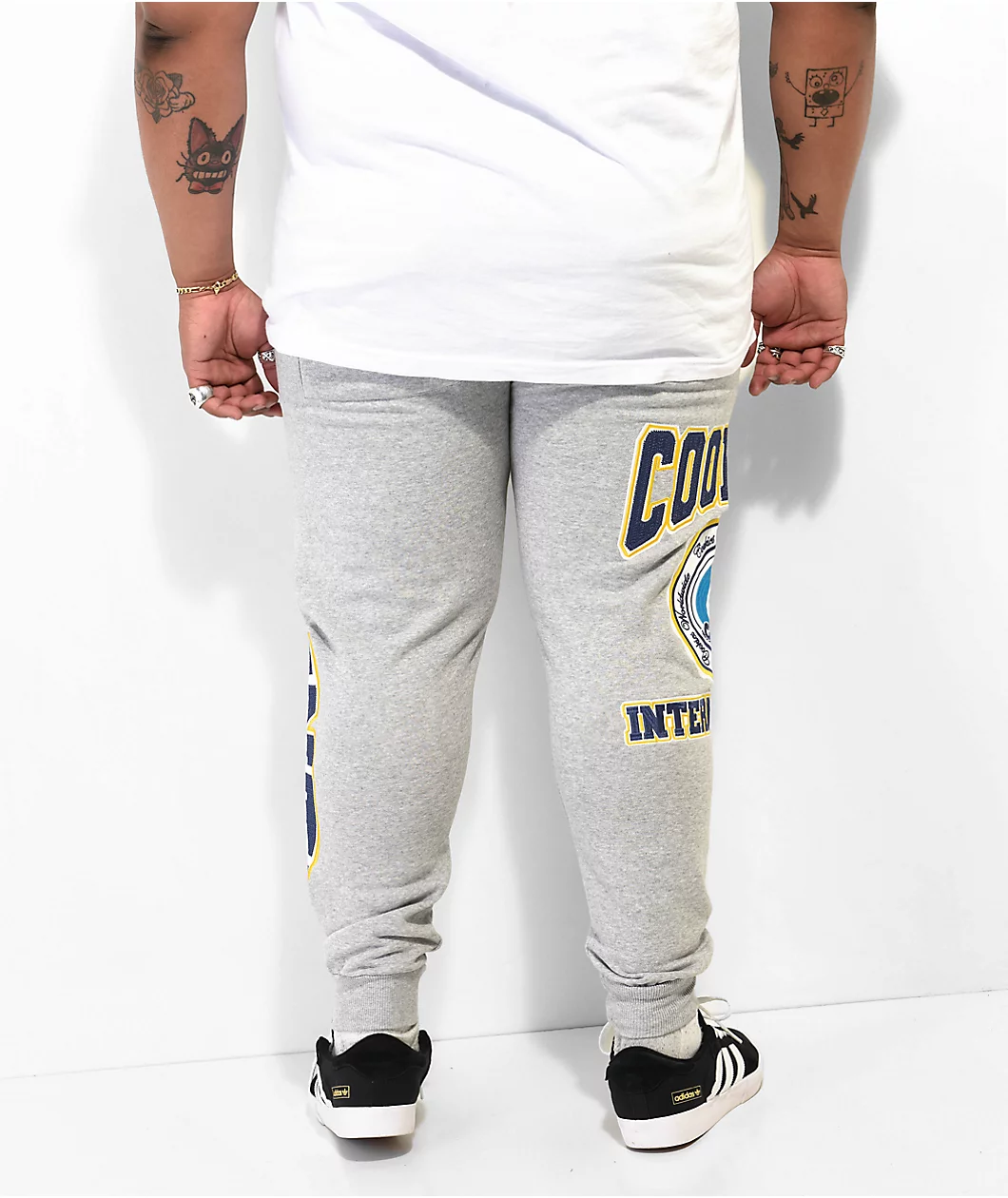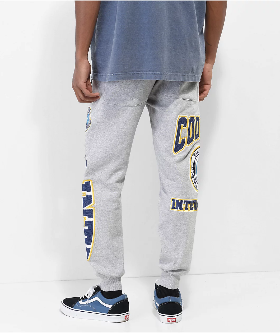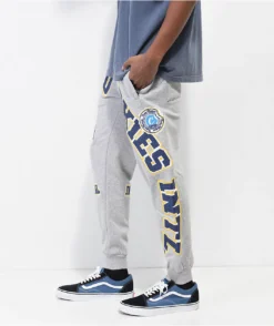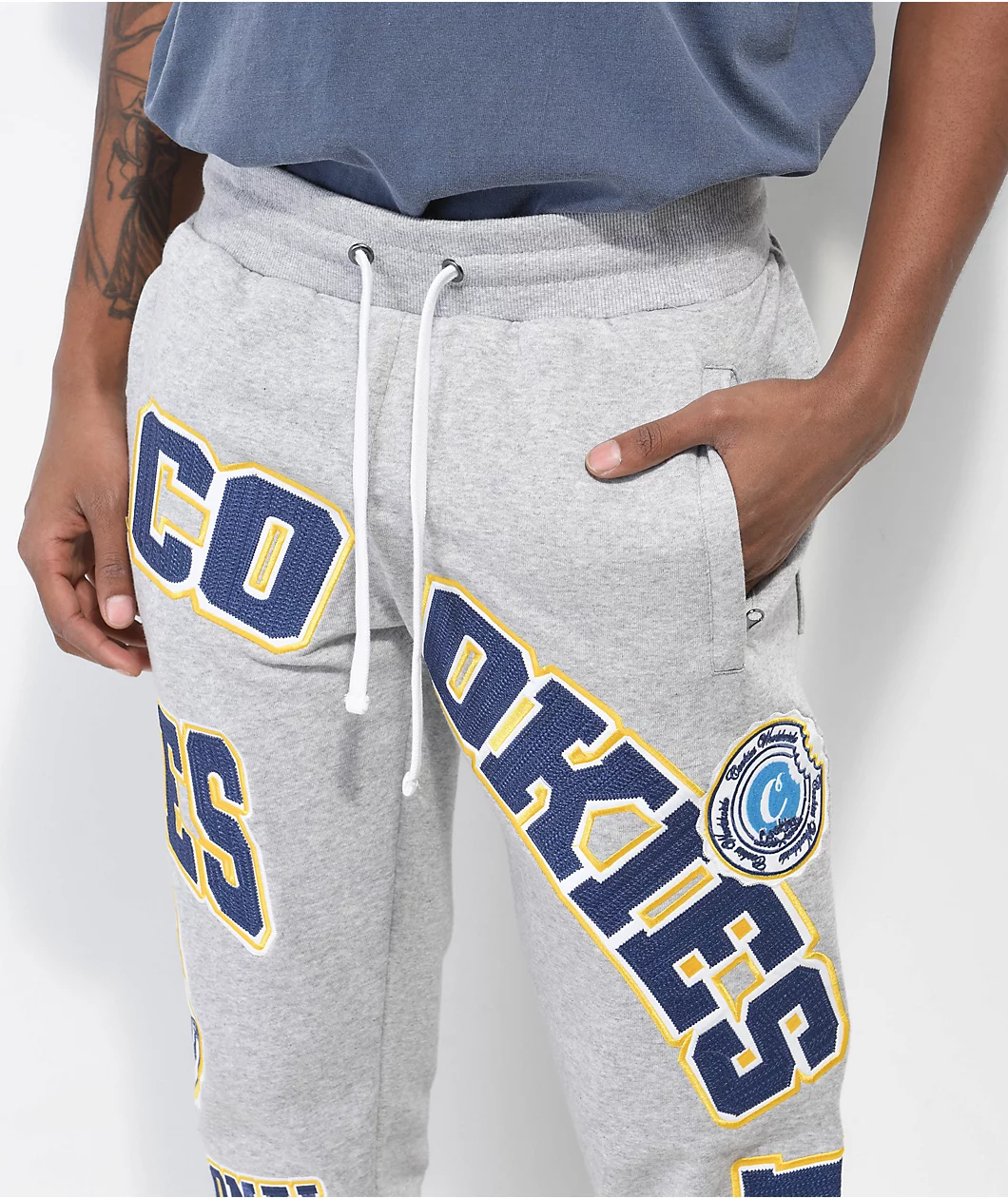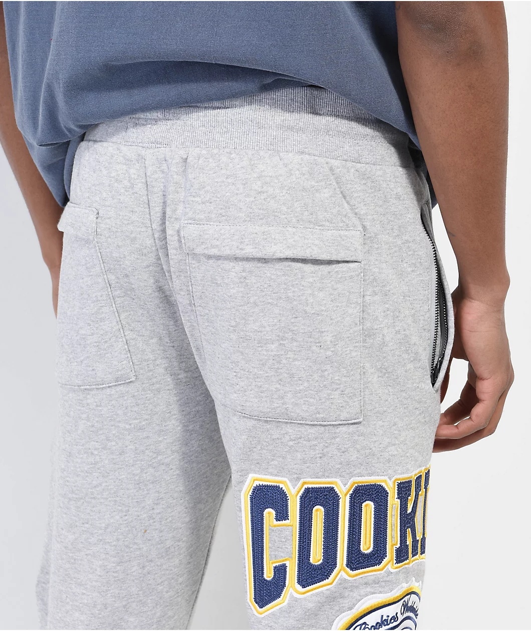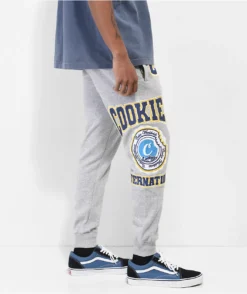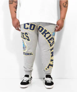 The Double Up sweatpants from Cookies come in a grey colorway, with navy blue and yellow brand messaging embroidered throughout. The Cookies jogger sweatpants have ribbed ankle cuffs, while a elastic drawstring waistband, and a simple 3-pocket design bring the casual look together.