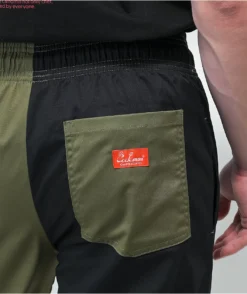 The Crazy Patter Cookman chef pants have a unique, split design, with a black right leg and olive green left leg, and the seat pockets sporting an inverse colorway. These pants were designed with functionality and comfortability in mind, as evident by the lightweight, breathable blend of polyester and cotton, and the elastic waistband with internal adjustable drawstring. The Cookman relaxed fit pants have a roomier thigh with a slight taper at the ankles, providing them a modern look.