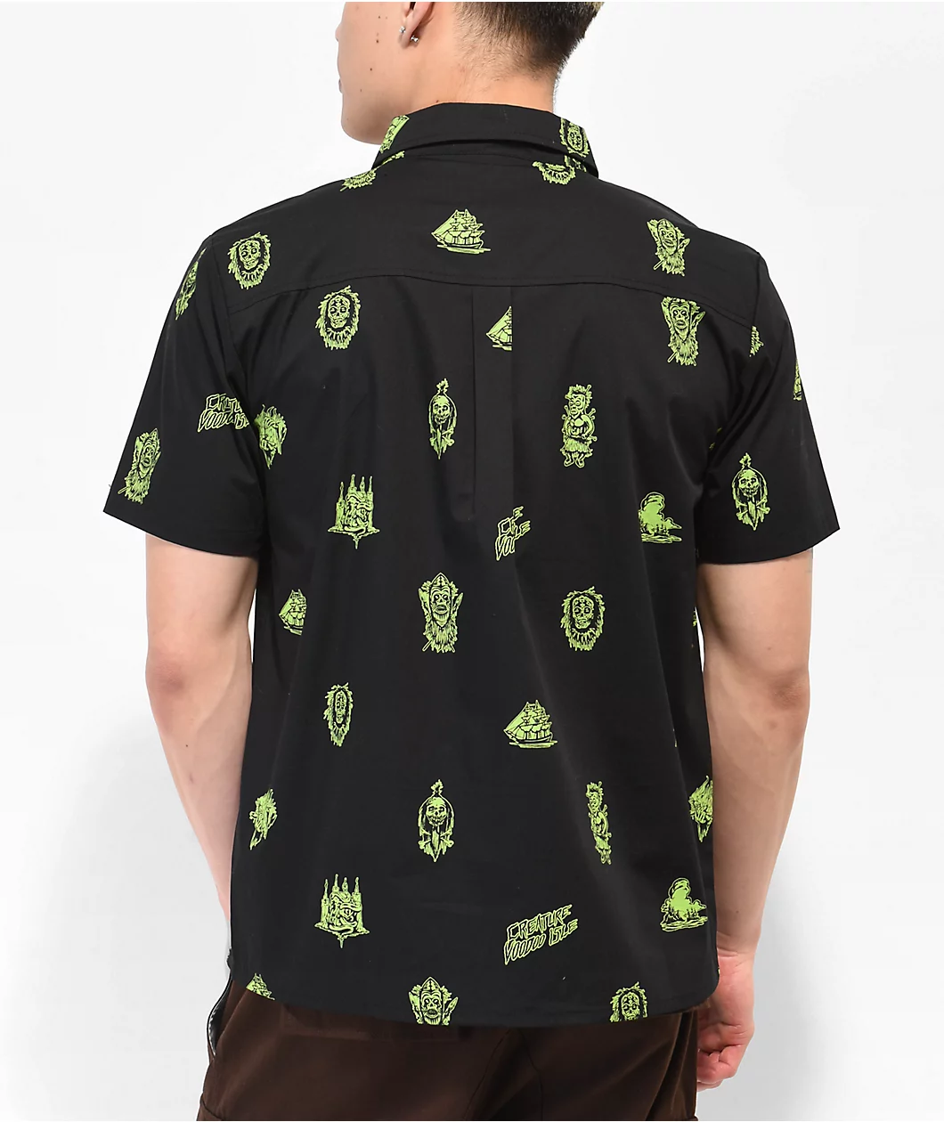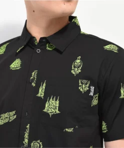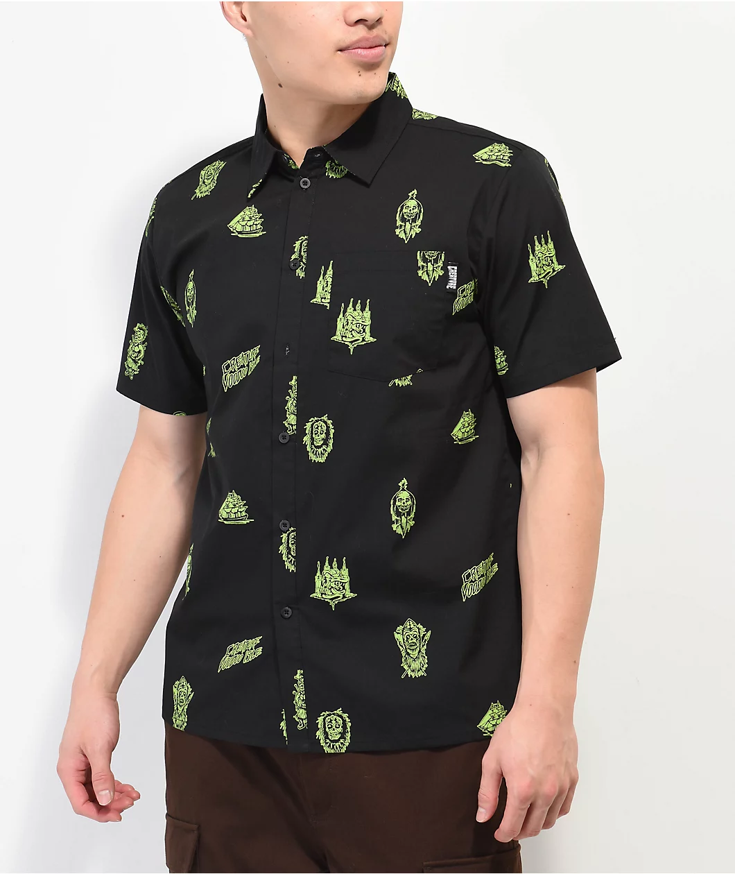 The Voodoo Isle button up shirt from Creature comes in a black colorway with sublimated graphics of edgy pirate and voodoo images throughout in a neon green. This cotton-blend button-up shirt has a traditional turndown collar with a patch pocket on the left of chest, adorned with a small brand tag.