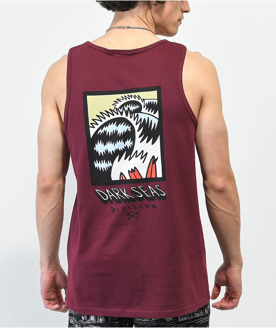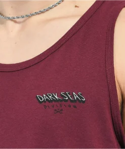 The Breakout Dark Seas tank top comes in a burgundy colorway with the brand name screen-printed on the front and a graphic of a wave screen-printed on the back. This tank top has a soft, 100% cotton construction featuring a relaxed fit with ribbed hems throughout.