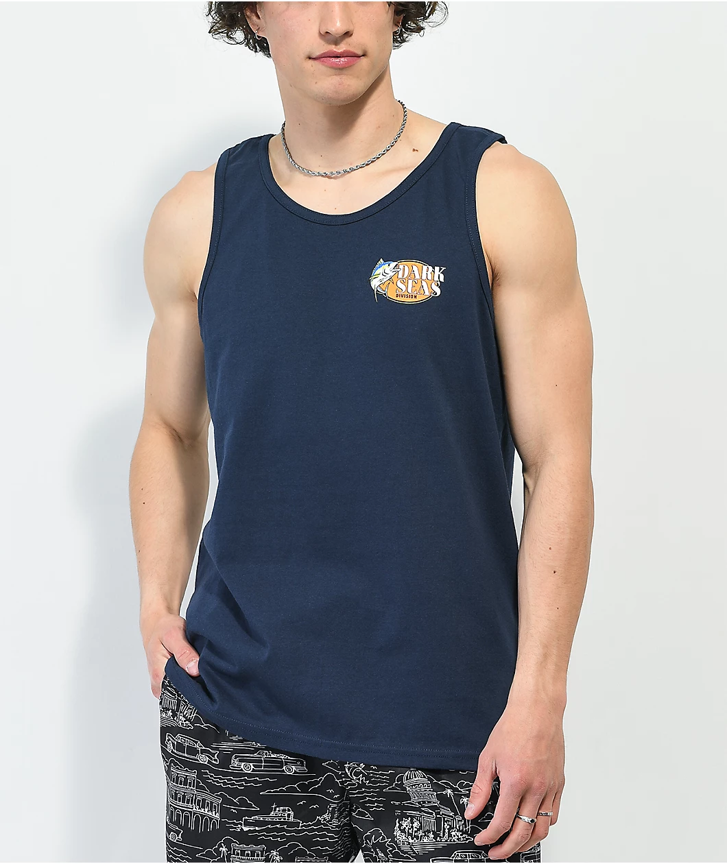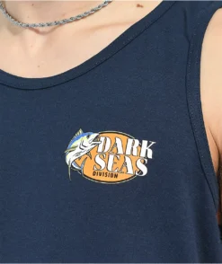 The Long Range Dark Seas tank top has a soft, 100% cotton construction and comes in a navy colorway with a screen-printed graphic of the brand logo in orange on the left side of the chest and on the back.