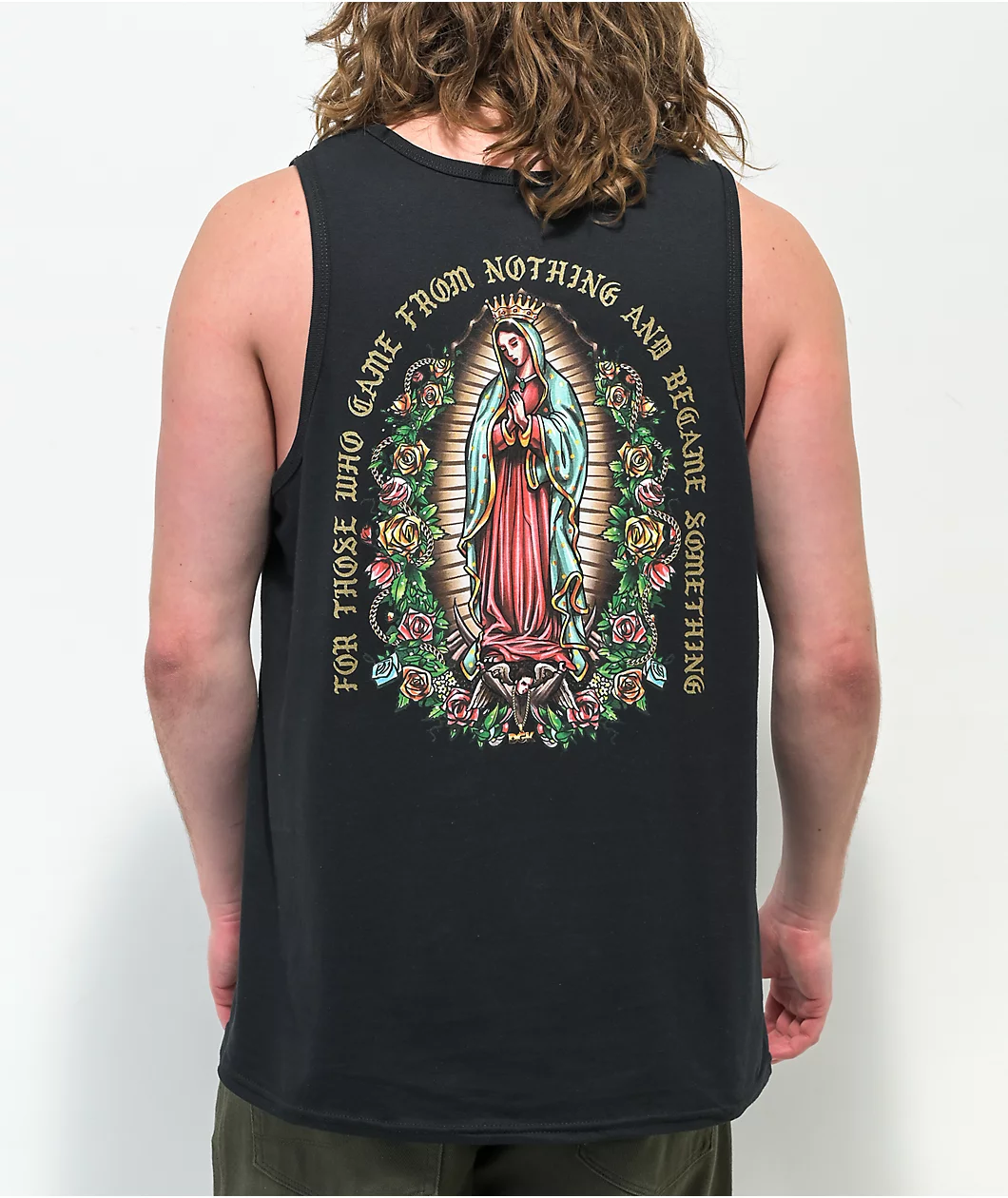 The Guadalupe tank top from DGK has a flowy, relaxed fit, and is made from lightweight, breathable cotton. It comes in a black colorway that’s outfitted with a screen-printed DGK logo and rose on the chest and on the back, a graphic of Our Lady of Guadalupe with arched text that reads “For those who came from nothing and became something.”