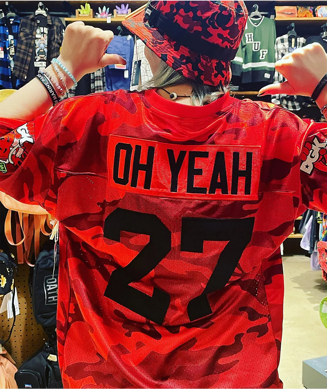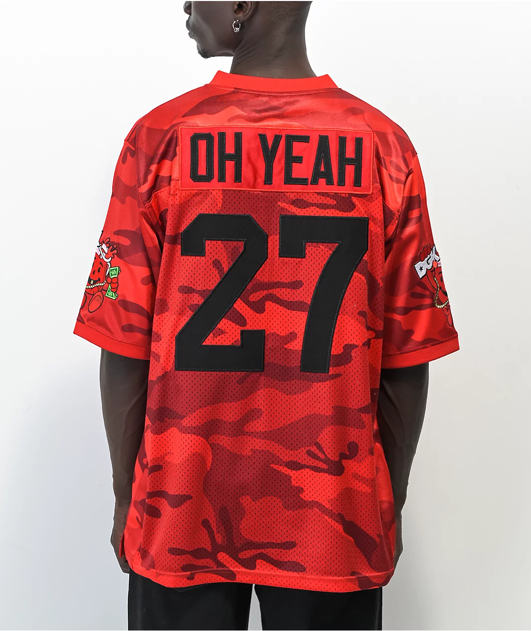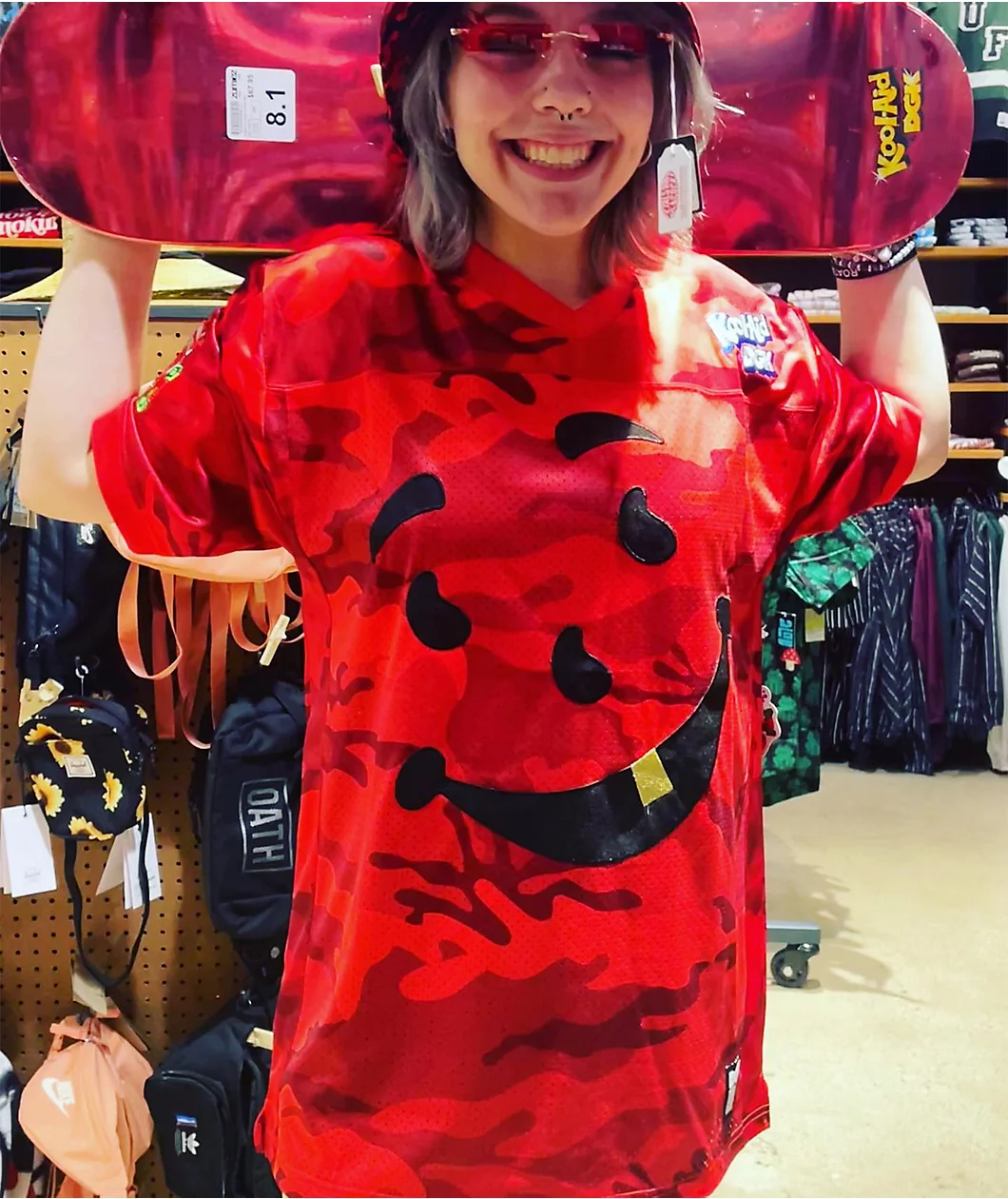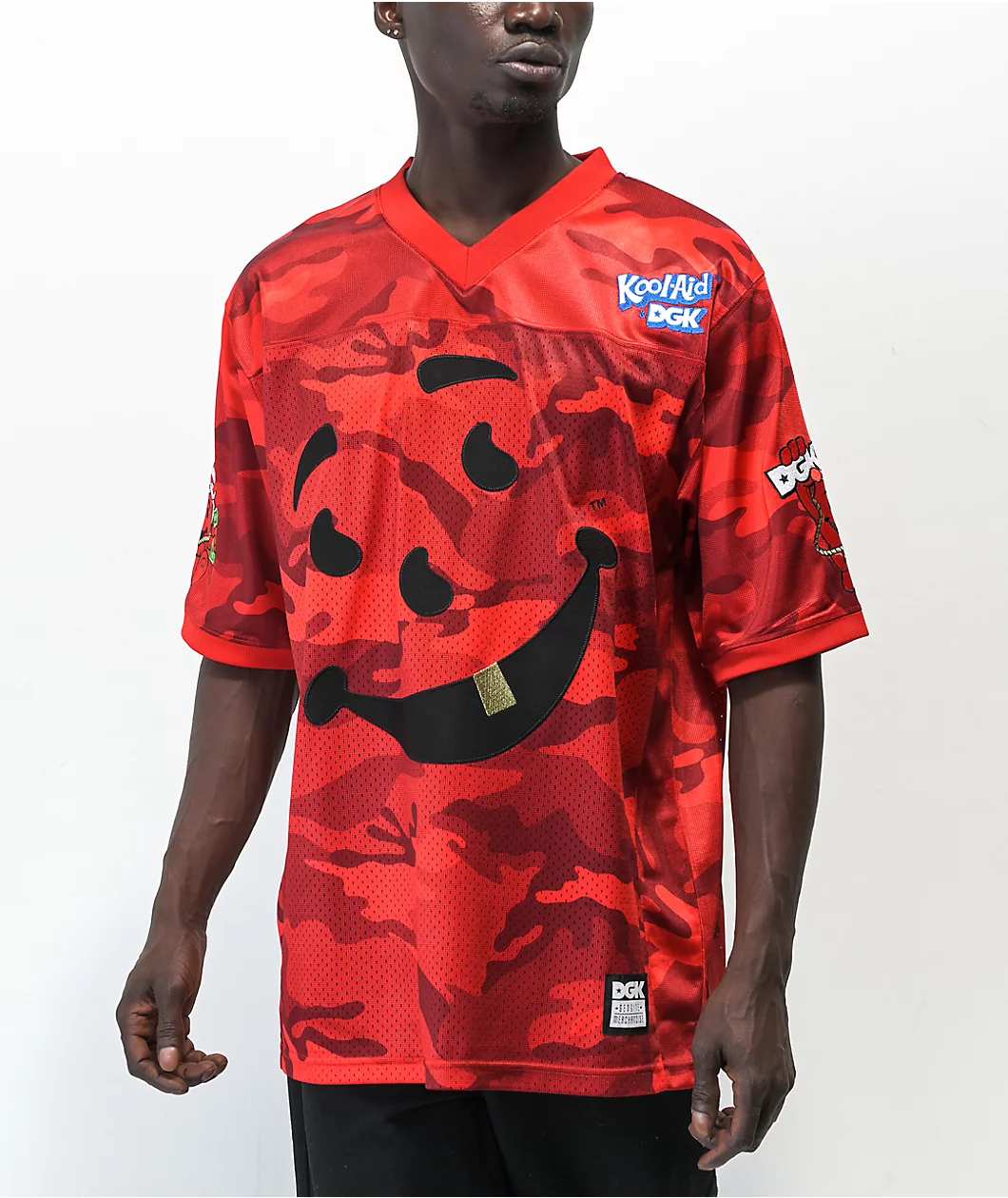 The Thirst football jersey from DGK and Kool-Aid comes in a red colorway with the Kool-Aid man’s face embroidered onto the front and the brand logo on the left shoulder and left sleeve. This 100% polyester jersey has a mesh construction with a v-neck collar.