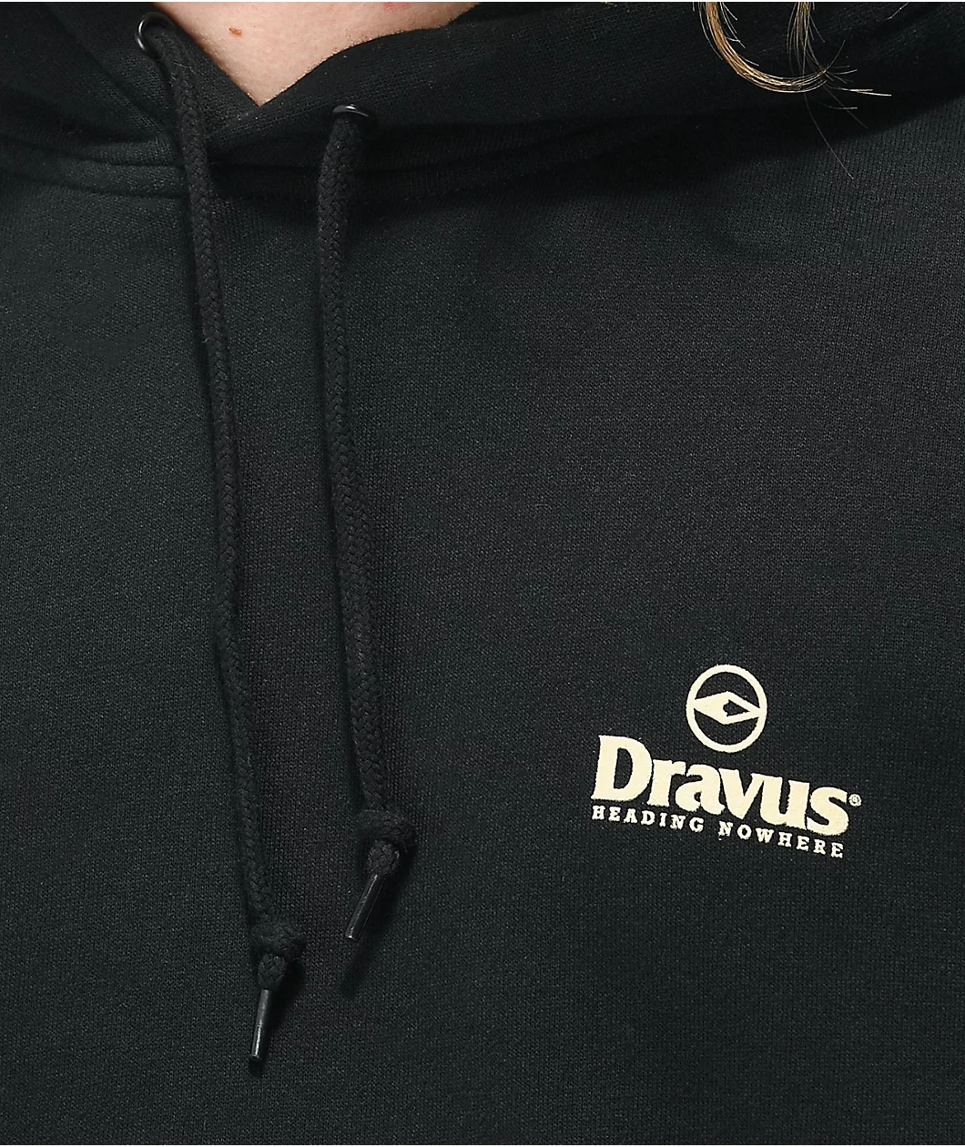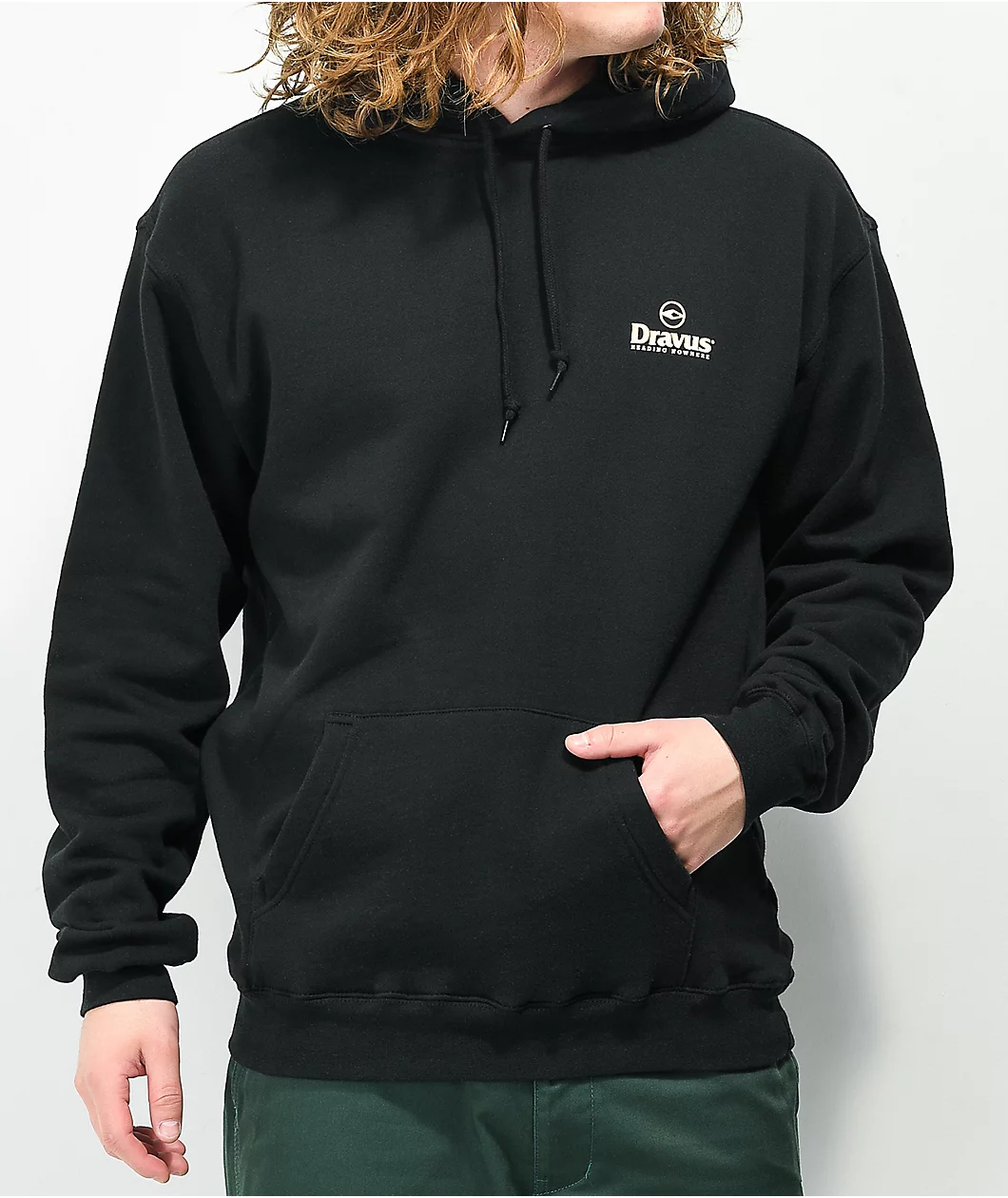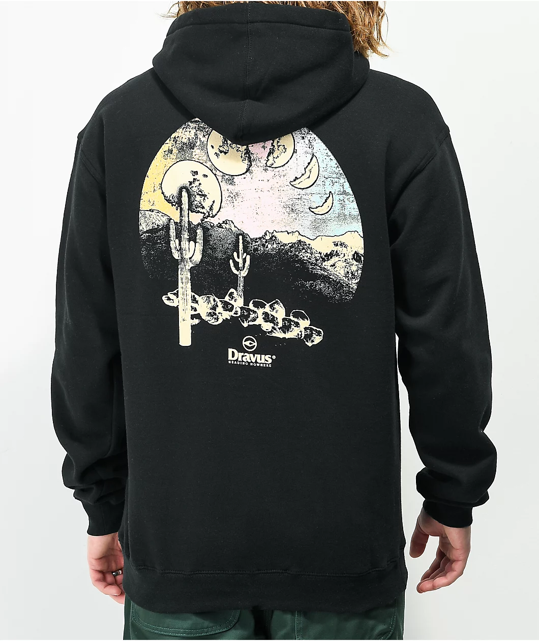 Seek shelter from the unrelaxing conditions that may befall you in the Dravus Many Moons black hoodie! This pullover has a black colorway and a cotton-poly blend, which are the perfect antidotes to anyone going through a hoodie crisis. On the left chest is a screen-printed Dravus logo, and on across the back, a pastel desertscape with a sequence of moons, ranging from crescent to full.
