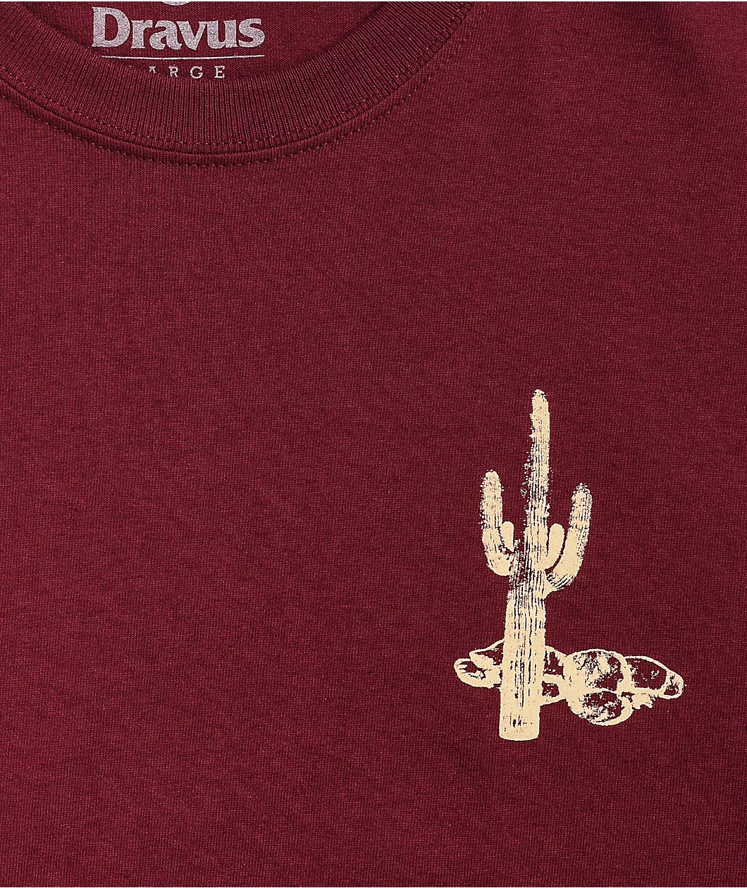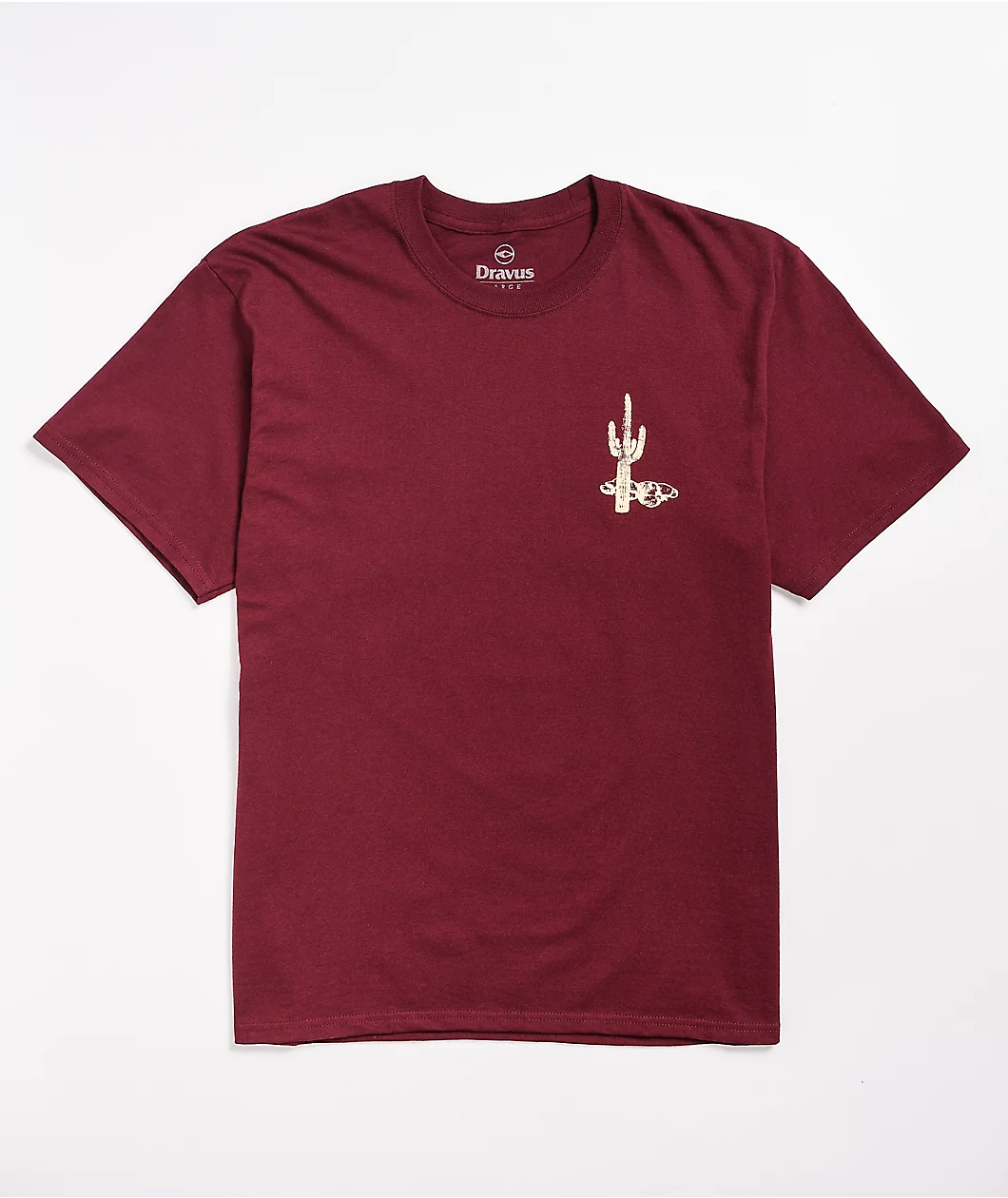 Craft some lunar looks with the Many Moons maroon t-shirt from Dravus! This tee comes in a dark red colorway, with a circular desert graphic on the back featuring the phases of the moon as they pass over the landscape for a stellar and stylish addition to your t-shirt rotation.