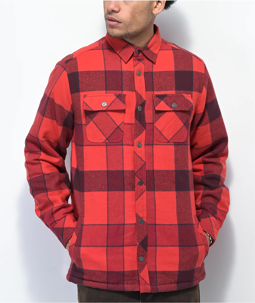 The Quilt Dravus jacket has a red and black plaid flannel exterior with a warm, quilted polyester interior. This Dravus shacket has a turndown collar, full button-up closure, dual button flap chest pockets, as well as dual slash hand pockets.
