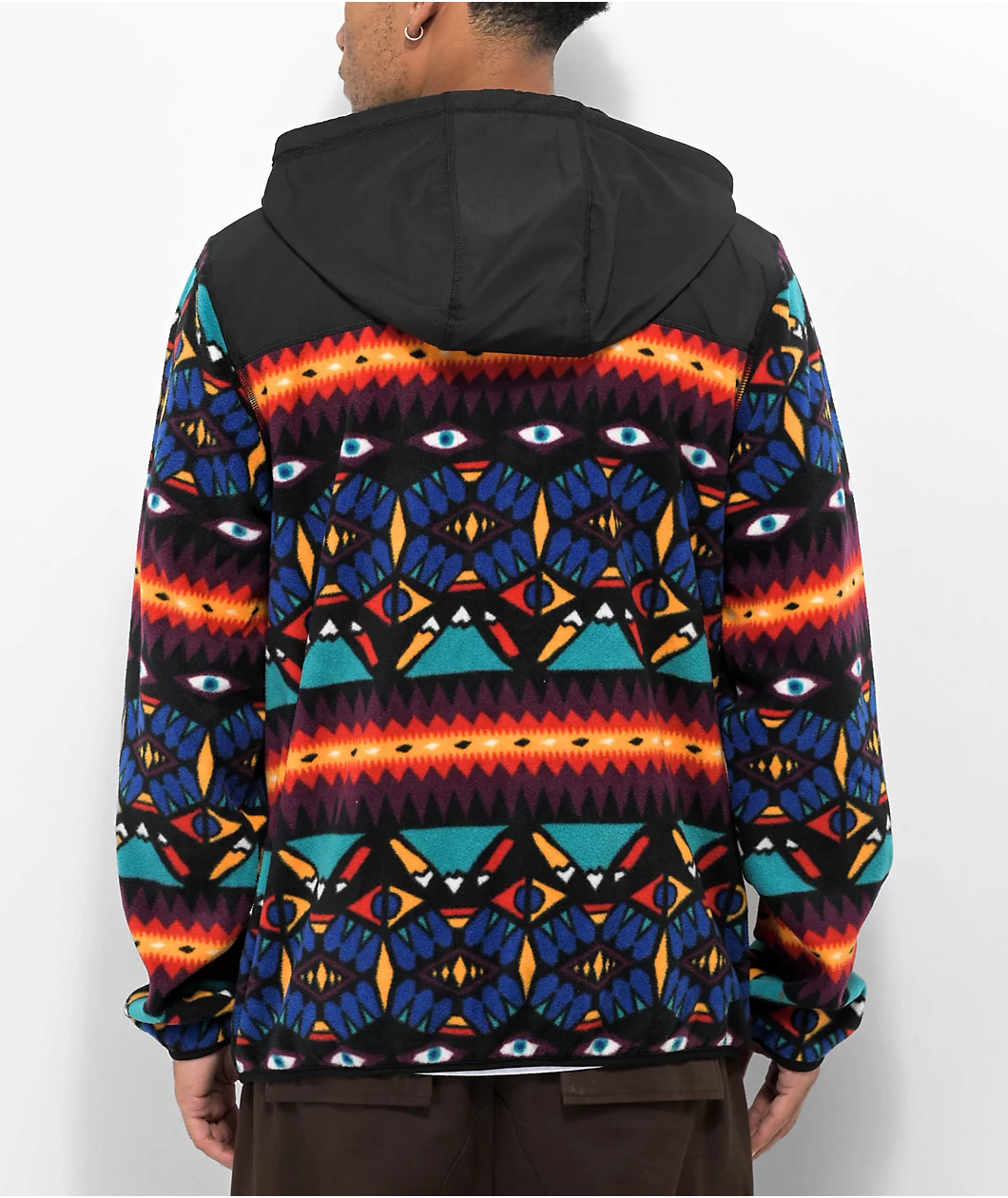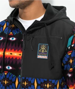 Dravus brings the Scenic Dream tech fleece, showing off a colorful geometric pattern throughout. A rubber brand patch can be seen left of chest just below a zippered compartment for storage, joined by dual slash hand pockets. This cozy winter clothing features an adjustable drawstring hood, coming complete with a full zip closure for easy layering.