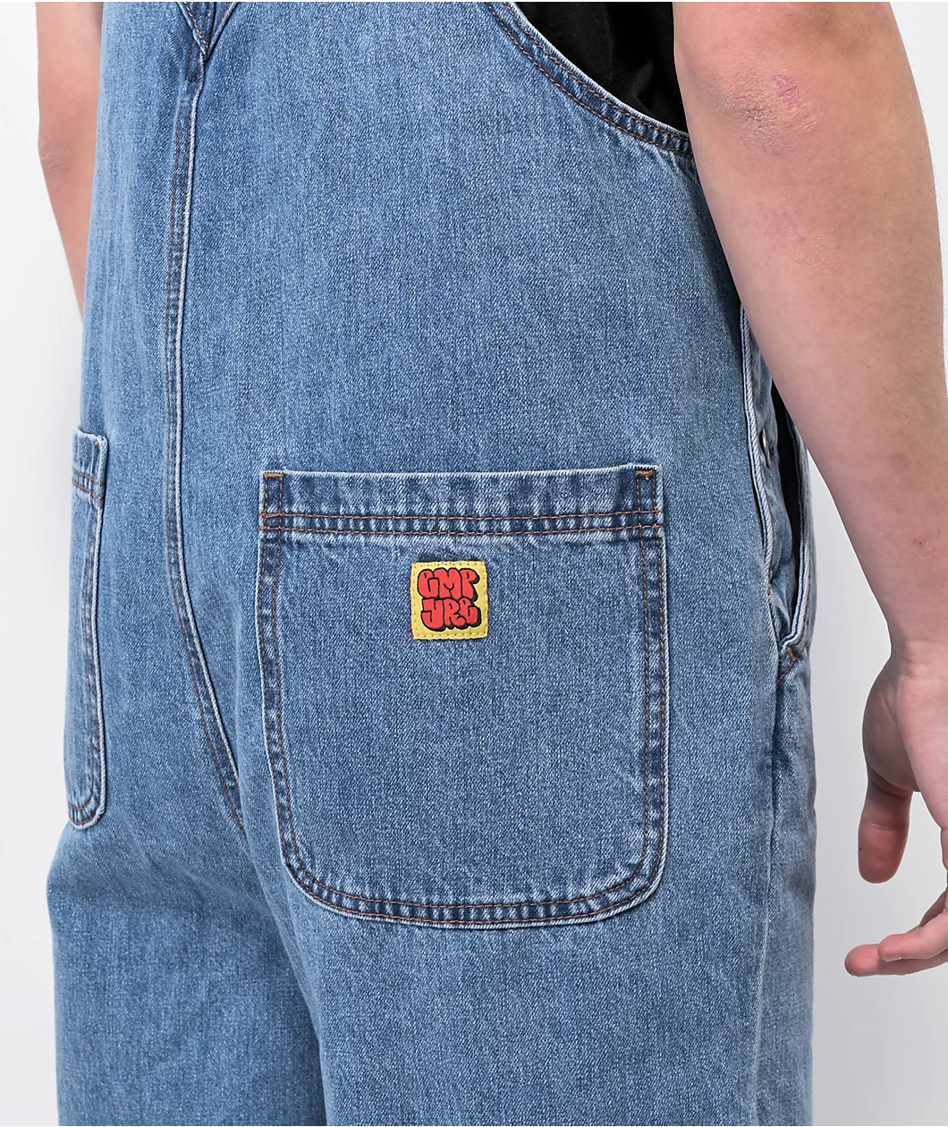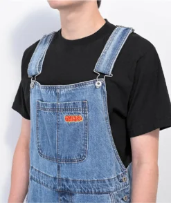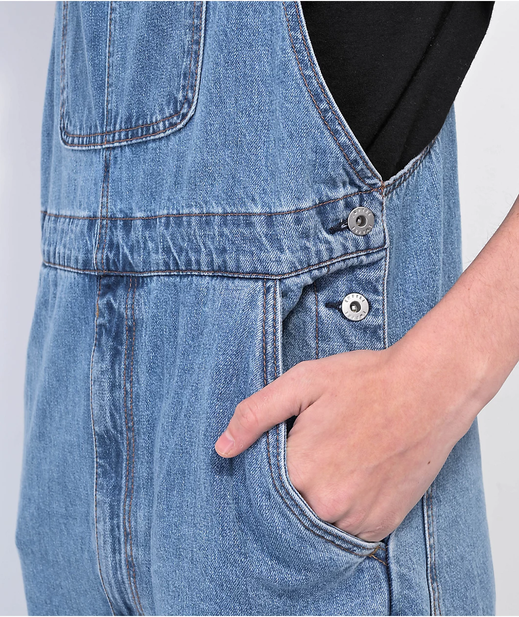 The Blake skate overalls come in a light wash denim construction, offering a custom fit with adjustable shoulder straps. A split pocket on the chest provides storage, along with a 4 pocket configuration; showing colorful branding left of chest and on the back right pocket. These overalls have a loose fit for a laid back look, made from a durable cotton material.