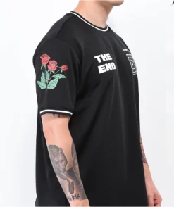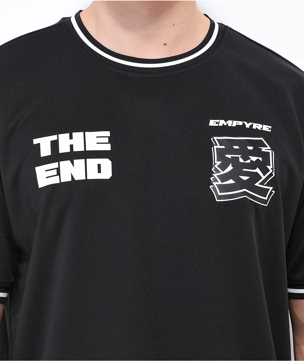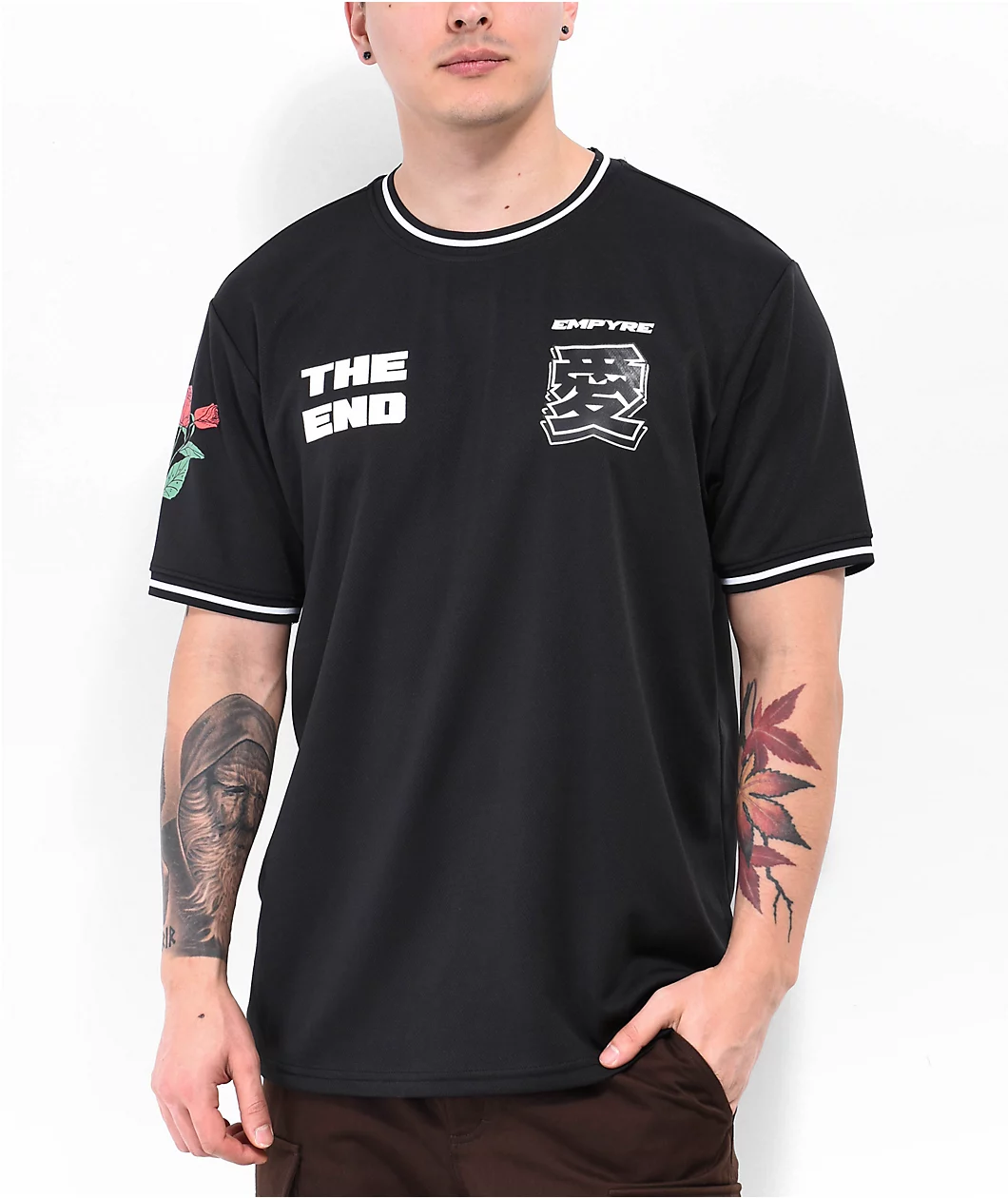 In a black colorway comes the Blue Steel soccer Jersey from Empyre, showing off script right of chest in white that reads “The End”, with Japanese lettering set below the brand name left of chest. A splash of color in green and red can be found in the screen-printed image of a bundle of roses on the right sleeve. This jersey offers breathability with the use of mesh throughout, coming complete with a durable polyester construction.