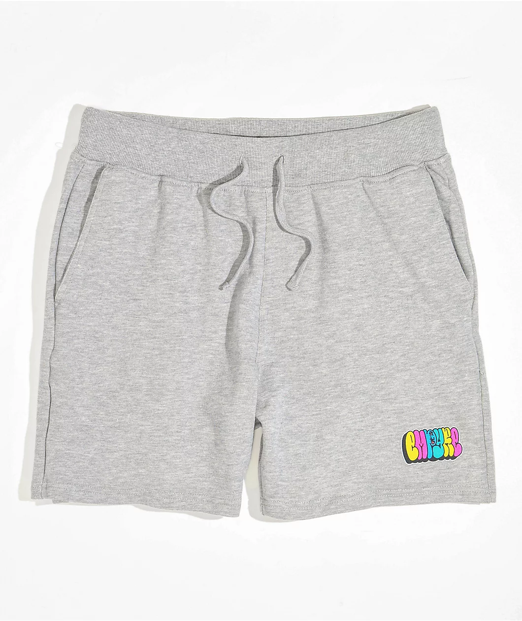 The Empyre Bubble Letter sweat shorts come in a grey colorway, with a colorful brand graphic screen-printed graphic on the left leg. Made of cozy 100% cotton, the Empyre shorts are finished with a ribbed drawstring waistband, a brushed interior, and slash hand pockets.