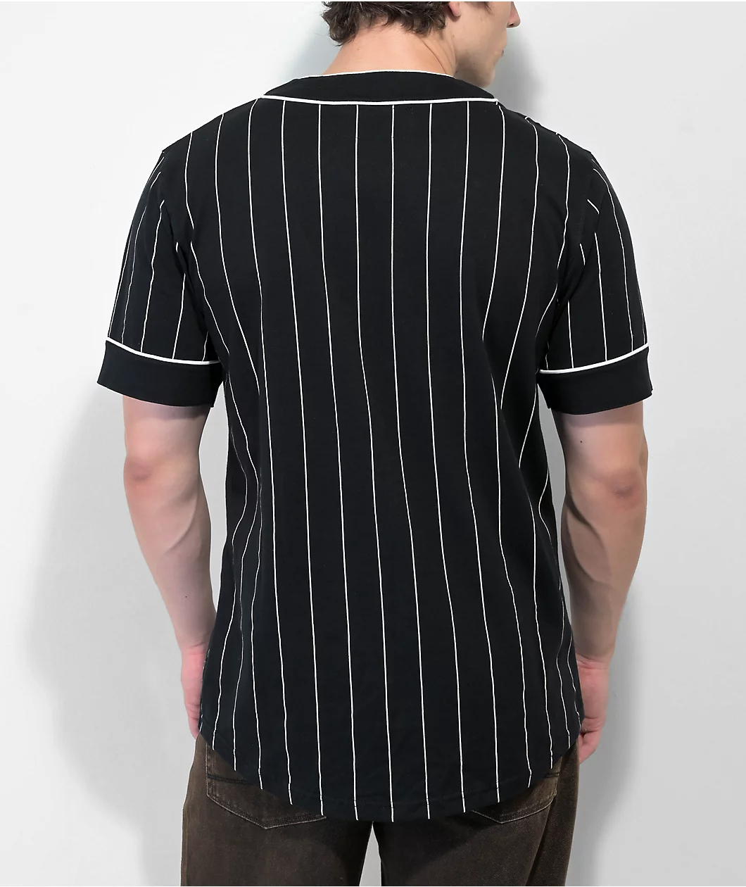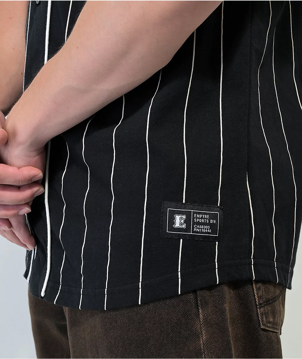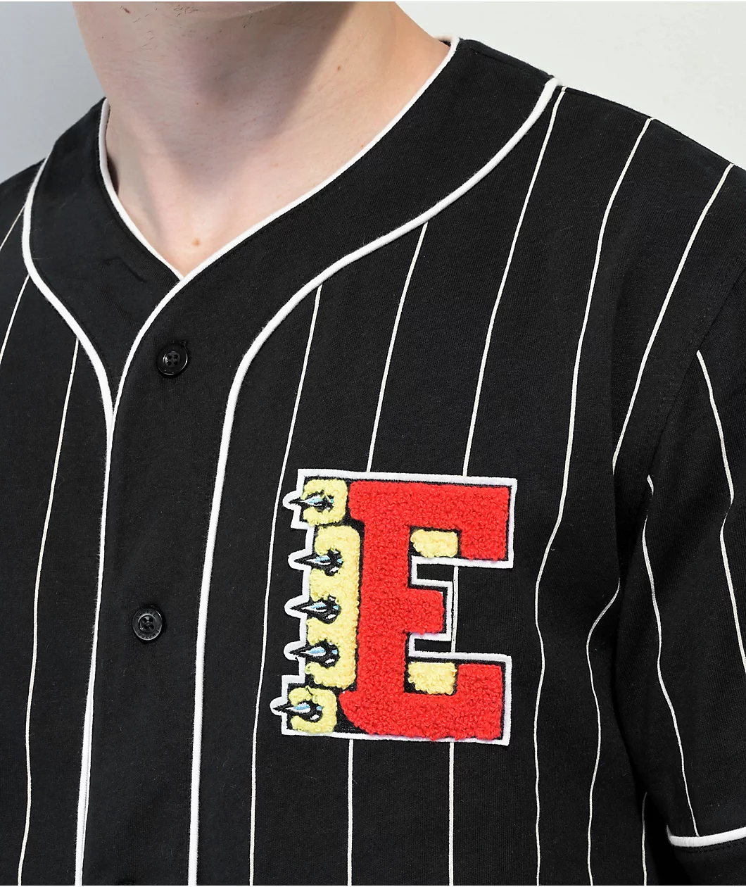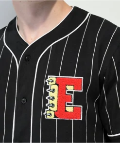 The Chuck Wind Up baseball jersey from Empyre comes in a black colorway with white pinstripes throughout and a woven “E” on the left of chest in red and yellow. This baseball jersey is made of 100% cotton with a v-neck collar and full button up closure.