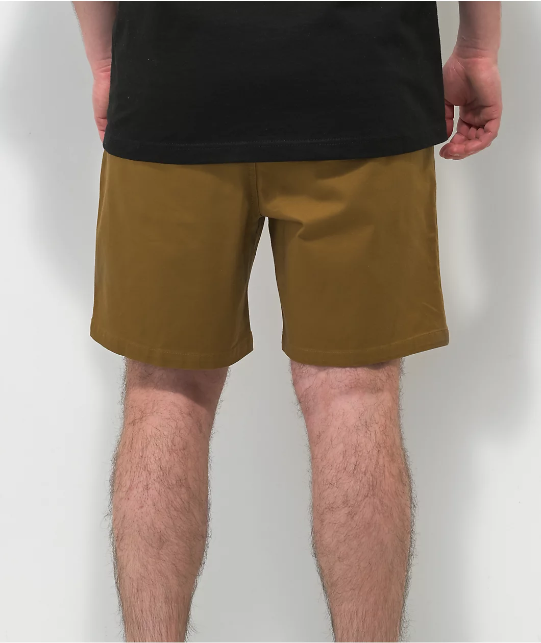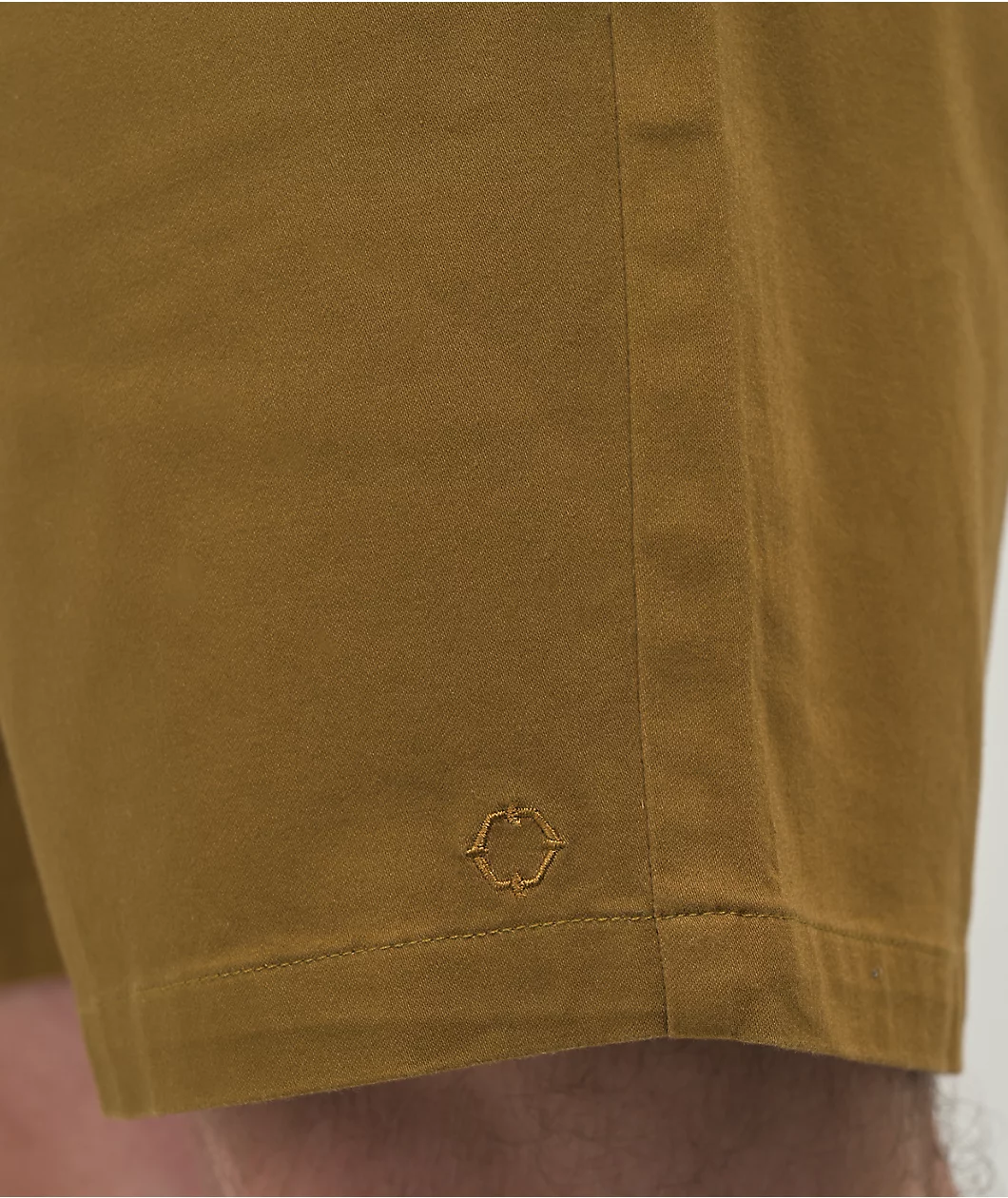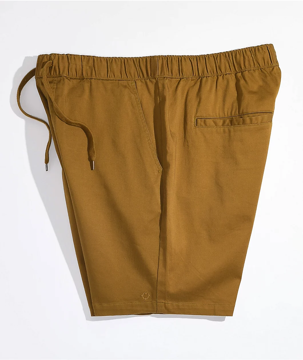 The Dixon Empyre shorts have a relaxed fit and are cut above the knee for unrestricted movement. They have a tobacco brown colorway and are minimally adorned with just a faint Empyre logo embroidered near the left leg opening. They have an elastic waist with an adjustable drawstring for a comfortable, customizable fit.
