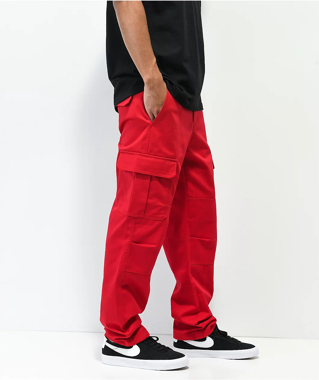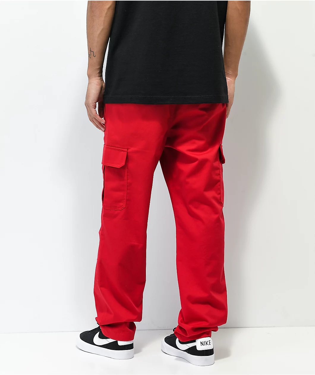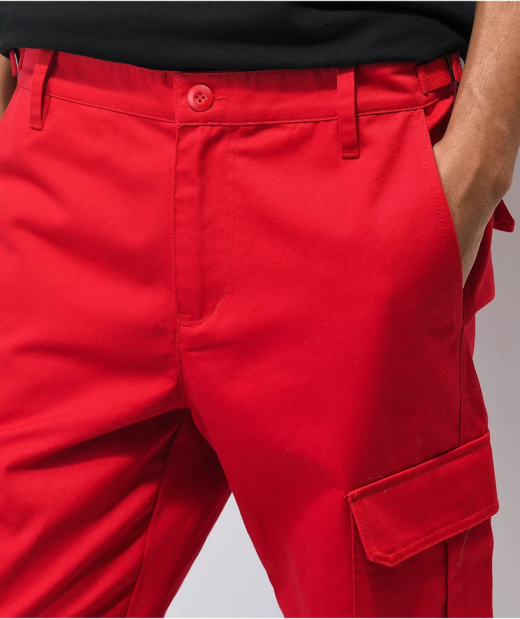 The Orders Empyre pants have a bright red colorway and a relaxed fit through the thigh with a slight taper at the ankle. Both legs are equipped with large, button closure cargo pockets, slash hand pockets, and button closure pockets on the backside. These Empyre cargo pants also have a reinforced panel on the knees, adjustable straps at the hips for a secure fit, and drawstrings at the ankle for a jogger look.