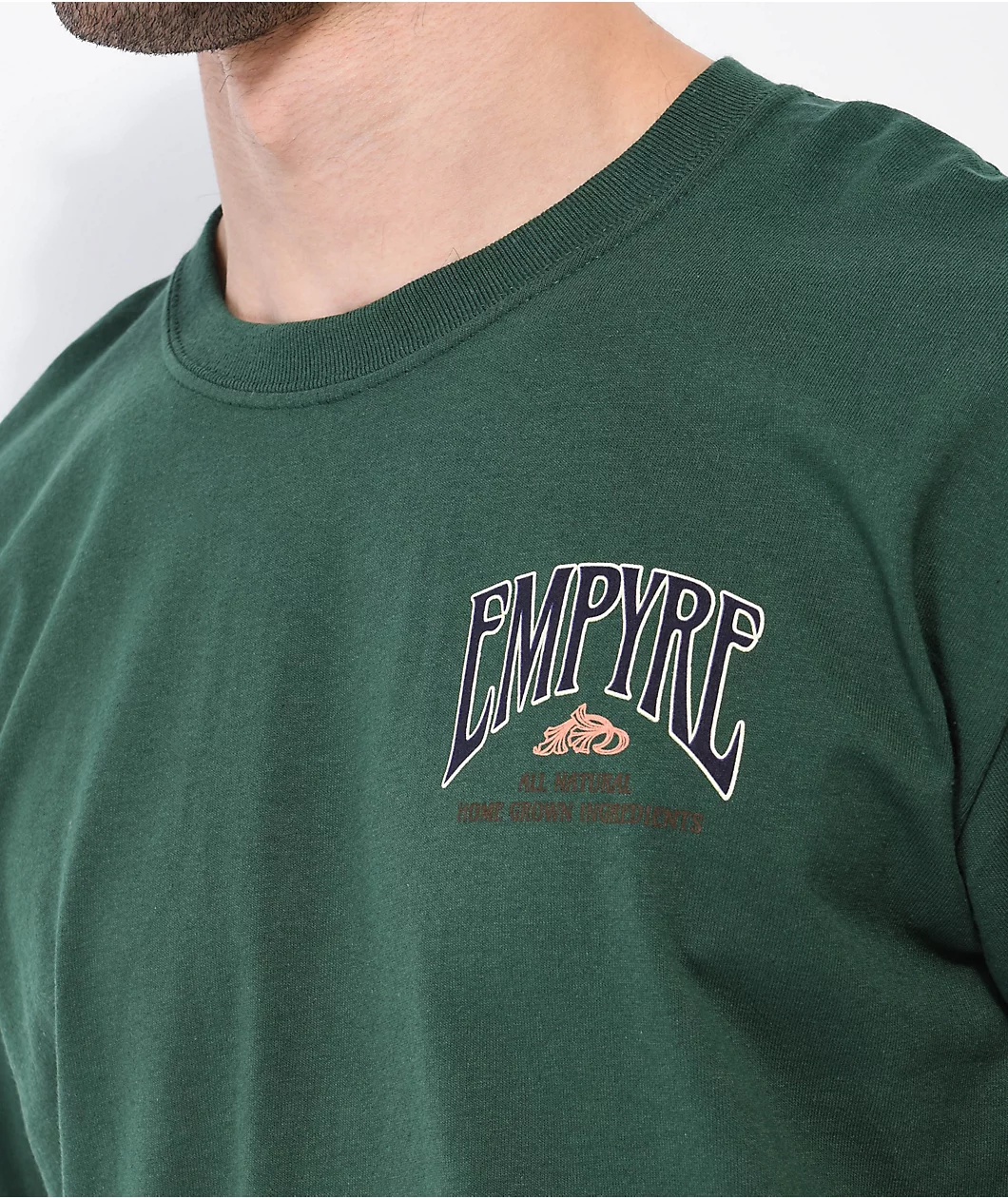The Rose Brew t-shirt from Empyre is made of 100% cotton and comes in a green colorway with a brand logo on the left of chest and a back graphic of roses with bright orange framing.