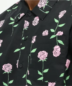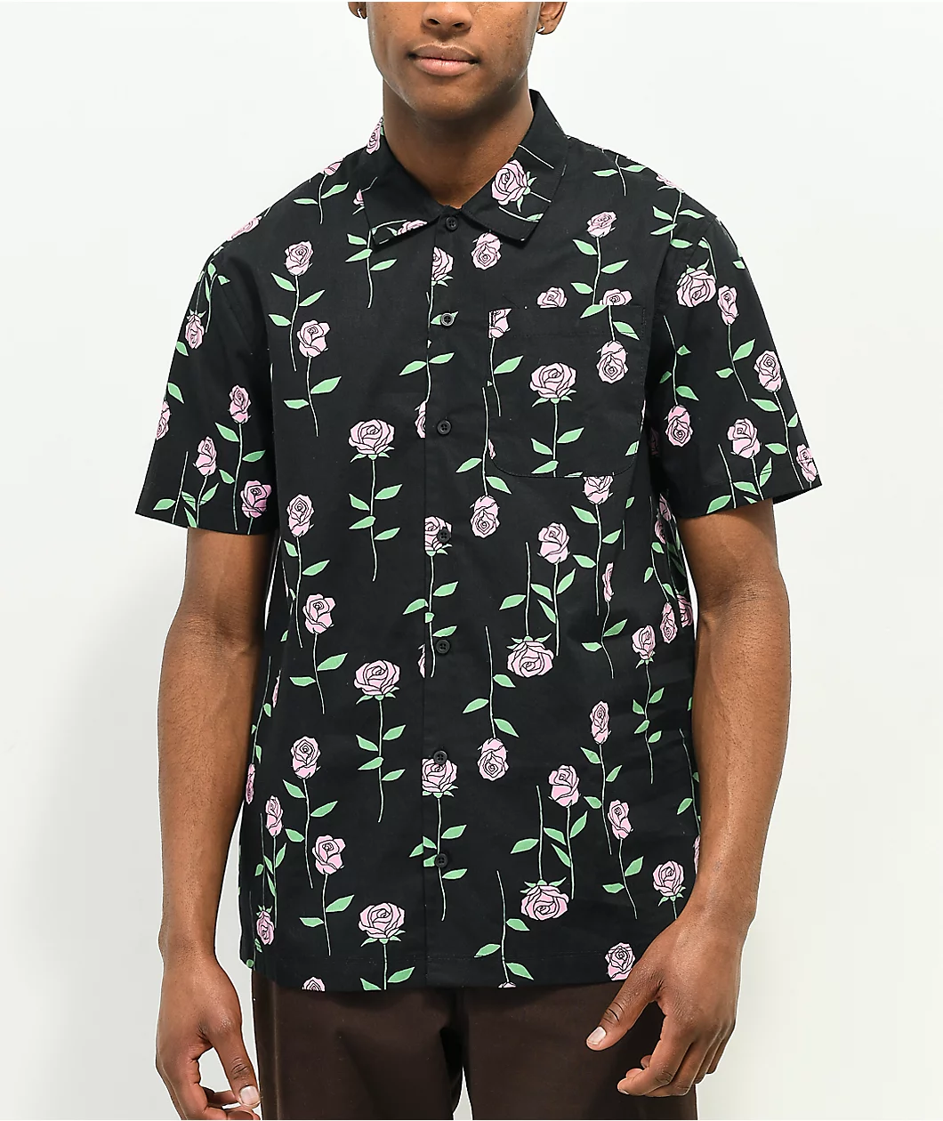 From Empyre comes the Rose Petals short sleeve button up shirt, which has a black colorway outfitted with sublimated graphics throughout of roses. This all over print shirt has a soft, lightweight cotton construction, a squared hemline, full-button closure, turndown collar, and relaxed boxy fit.