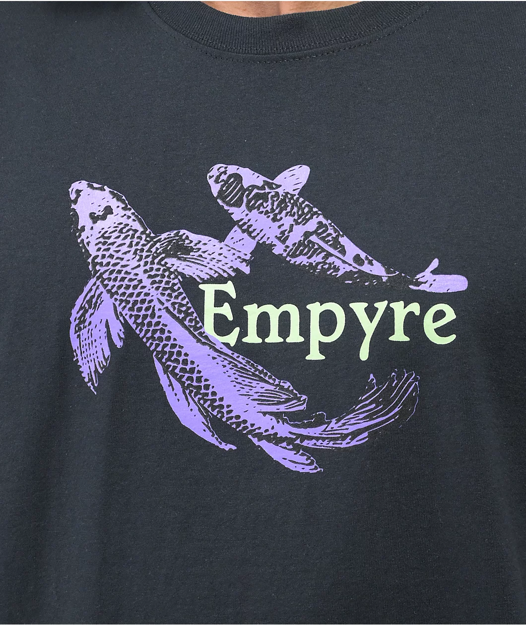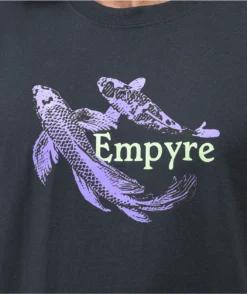Go with the flow in Empyre’s Stream black t-shirt! This top comes in an all-black colorway, with a relaxed fit and a lightweight cotton construction keeping the top comfortable and cool on warmer days. A screen-printed graphic of a skull surrounded by a school of purple koi decorates the shirt’s back, with text reading “Stream Of Consciousness” crossing the cranium for a dose of psychedelic steez.