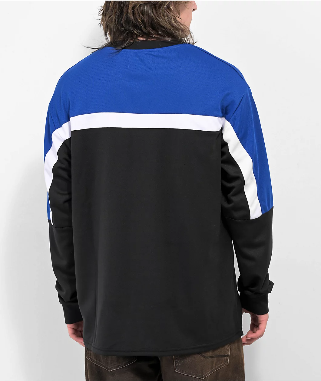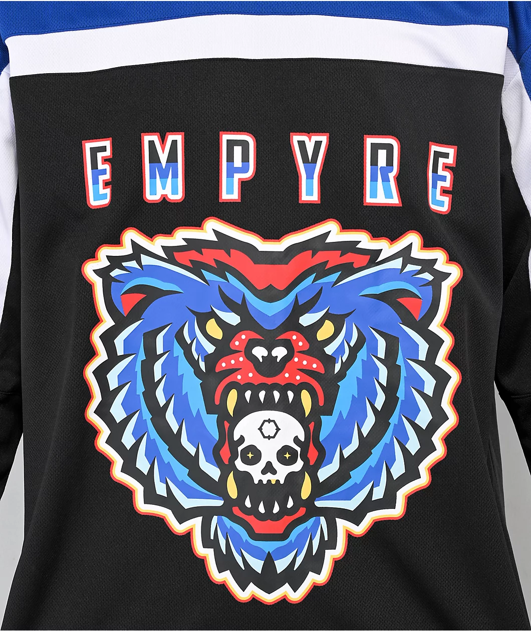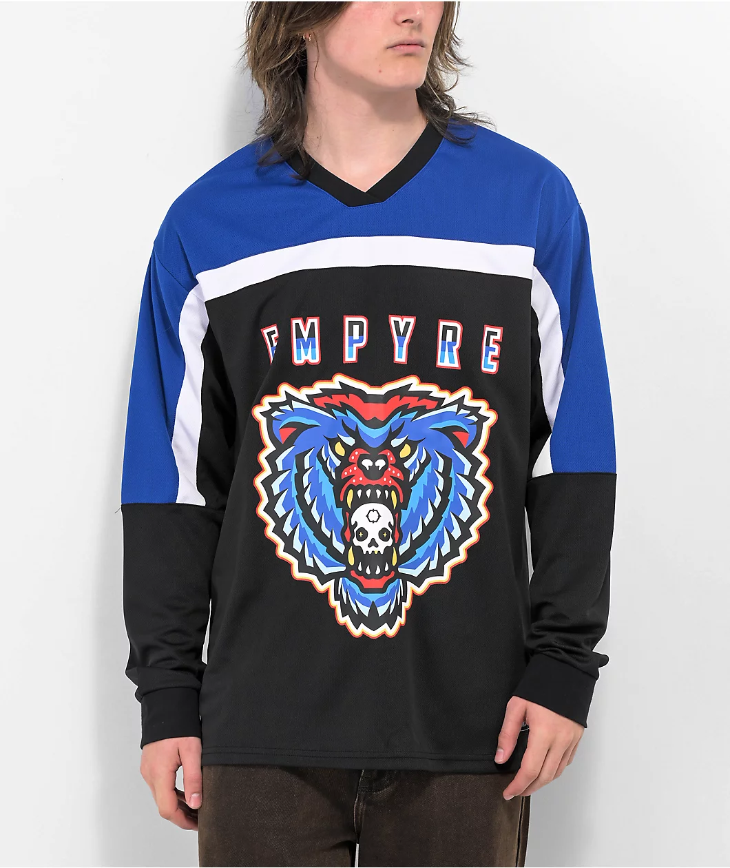 Coming in a blue mesh construction, the Empyre White Knuckle hockey jersey adds a sporty yet casual look to your outfits. This blue hockey jersey boasts a screen-printed bear on the front, as color blocked accents can be seen along the shoulders. Able to be worn alone or with layers, this Empyre hockey jersey is finished with a V-neck collar, and a woven tag on the bottom hem.