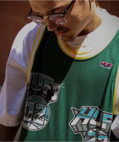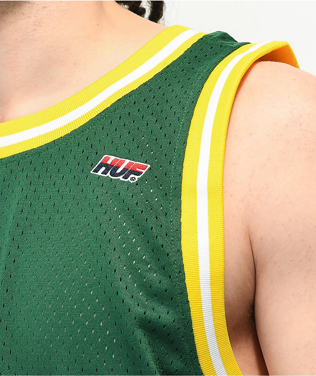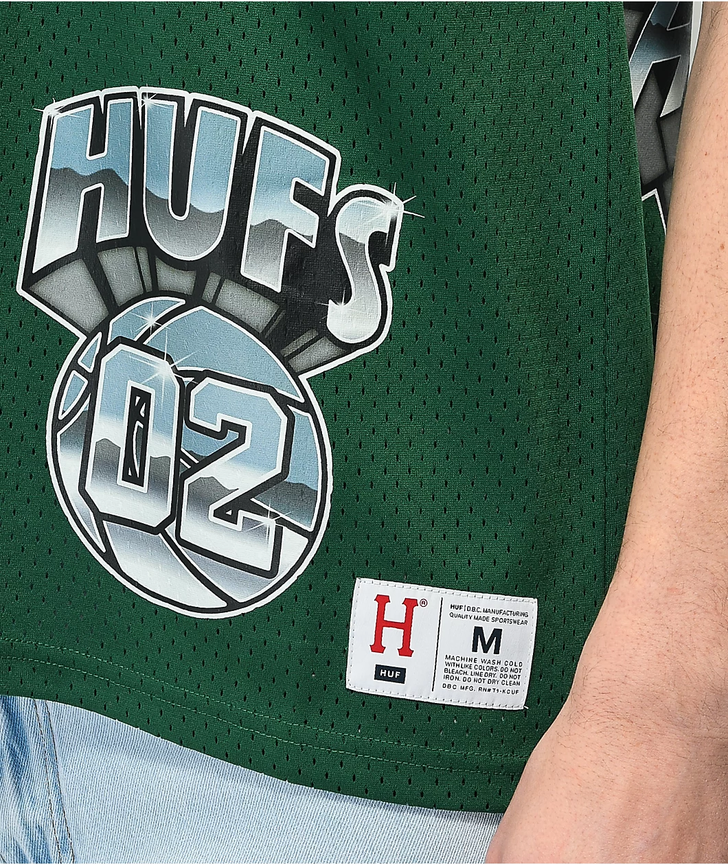 Represent HUF Worldwide with their HUF’s green basketball jersey! This jersey features an incredibly soft, breathable, and lightweight polyester construction with a ribbed collar and a sleeveless silhouette. Decorating the green jersey are screen-printed HUF’s logos throughout, adding bold, sport-infused branding to any outfit you craft.