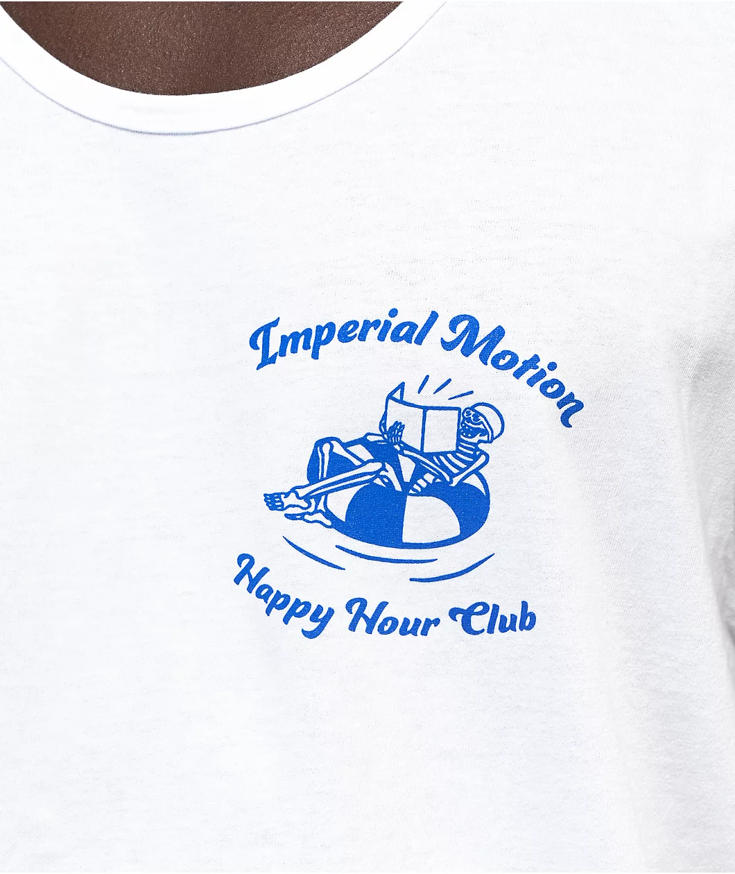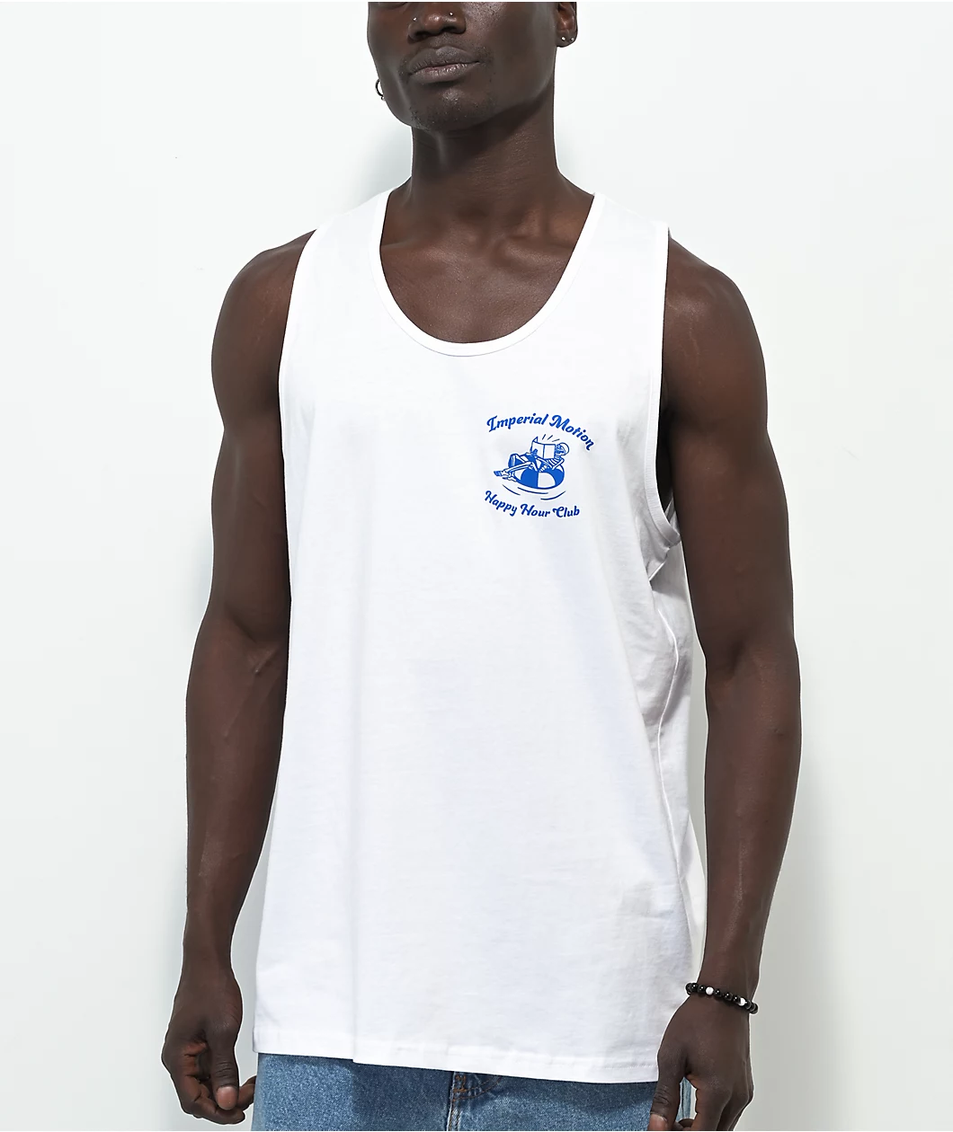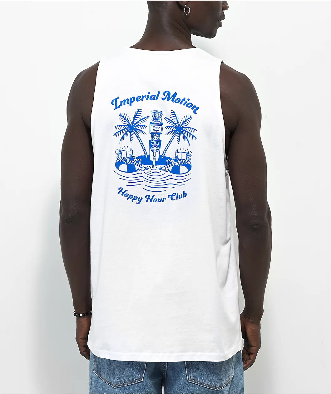 The Happy Hour Club white tank top from Imperial Motion comes in a soft, 100% cotton construction and features a a small graphic of a skeleton in a pool floatie on the left side of the chest as well as a large graphic of multiple skeletons lounging near a beach with the brand name and the text, “Happy hour club,” surrounding it on the back.
