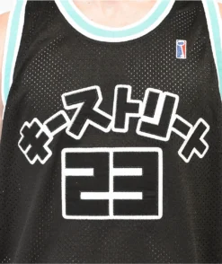 Adding a athletic streetwear-inspired look to your wardrobe, this black and blue basketball jersey from Key Street is sure to be a favorite. Made from breathable polyester mesh, the sleeveless silhouette has embroidery on the chest and back, while blue striped accents along the neck and arms add contrast. The Key Street basketball jersey is finished with a red and blue applique near the left chest, and a woven brand label near the bottom hem.