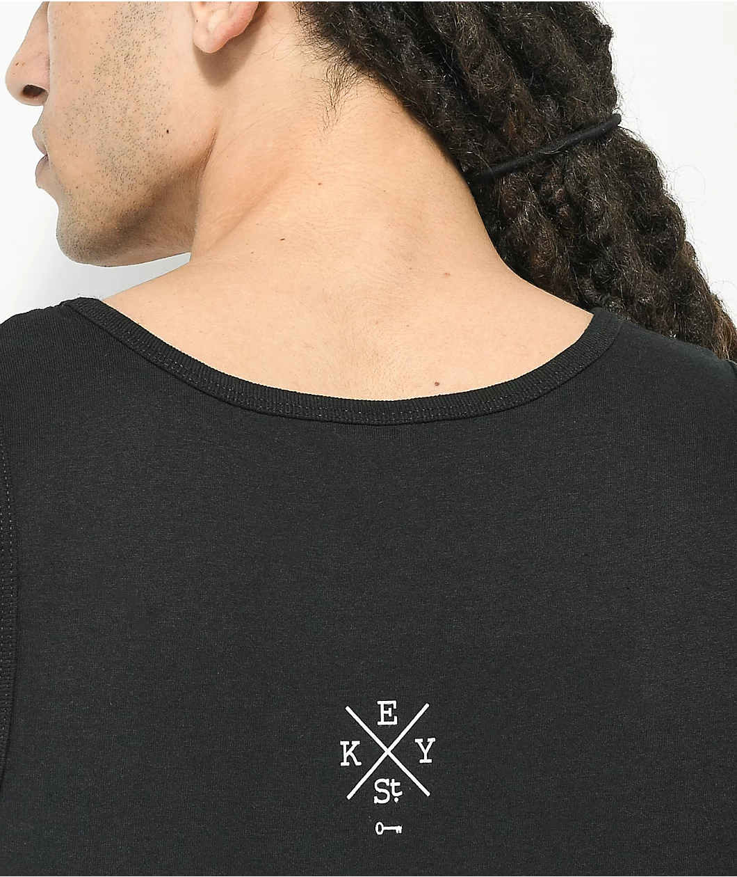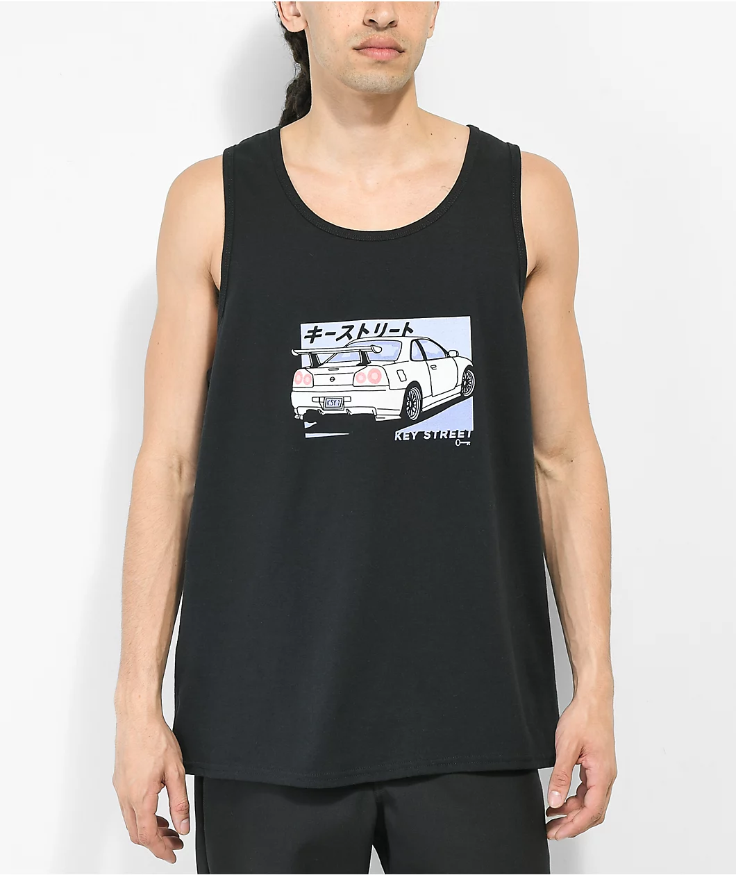 The Kaiju tank top from Key Street comes in a black colorway with a screen-printed graphic on the front of a white car boasting a “K3Y5T” license plate, as well as on the nape of neck of the brand logo. This tank top is made of 100% cotton and comes in a regular fit for comfortable, all day wear.