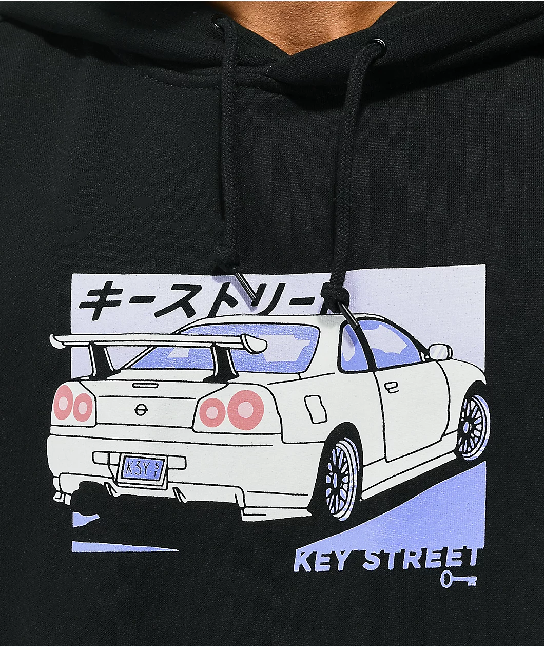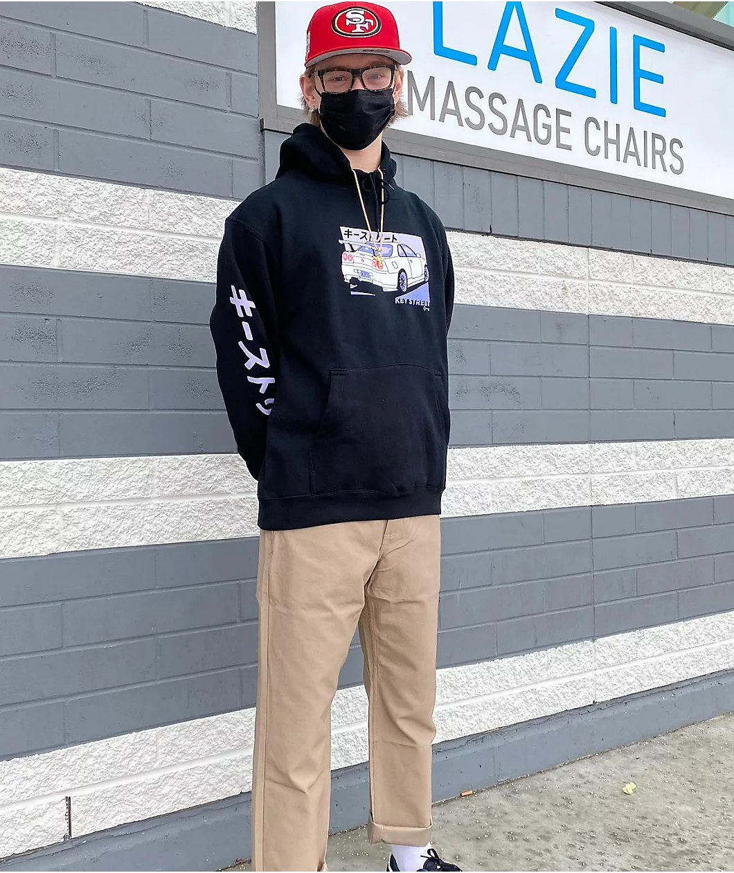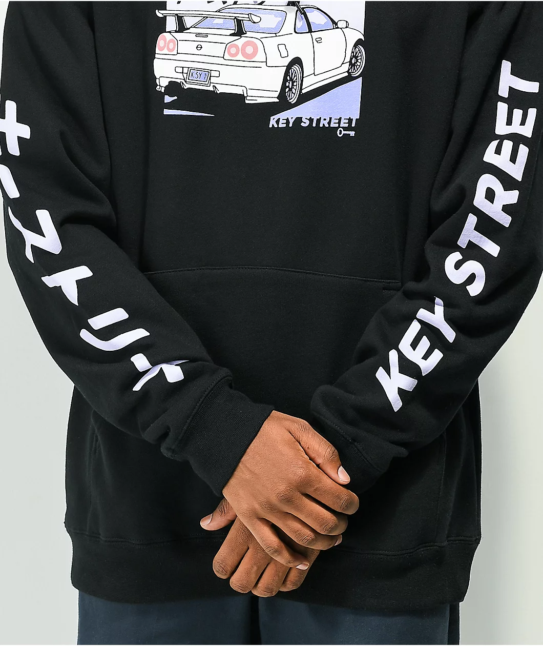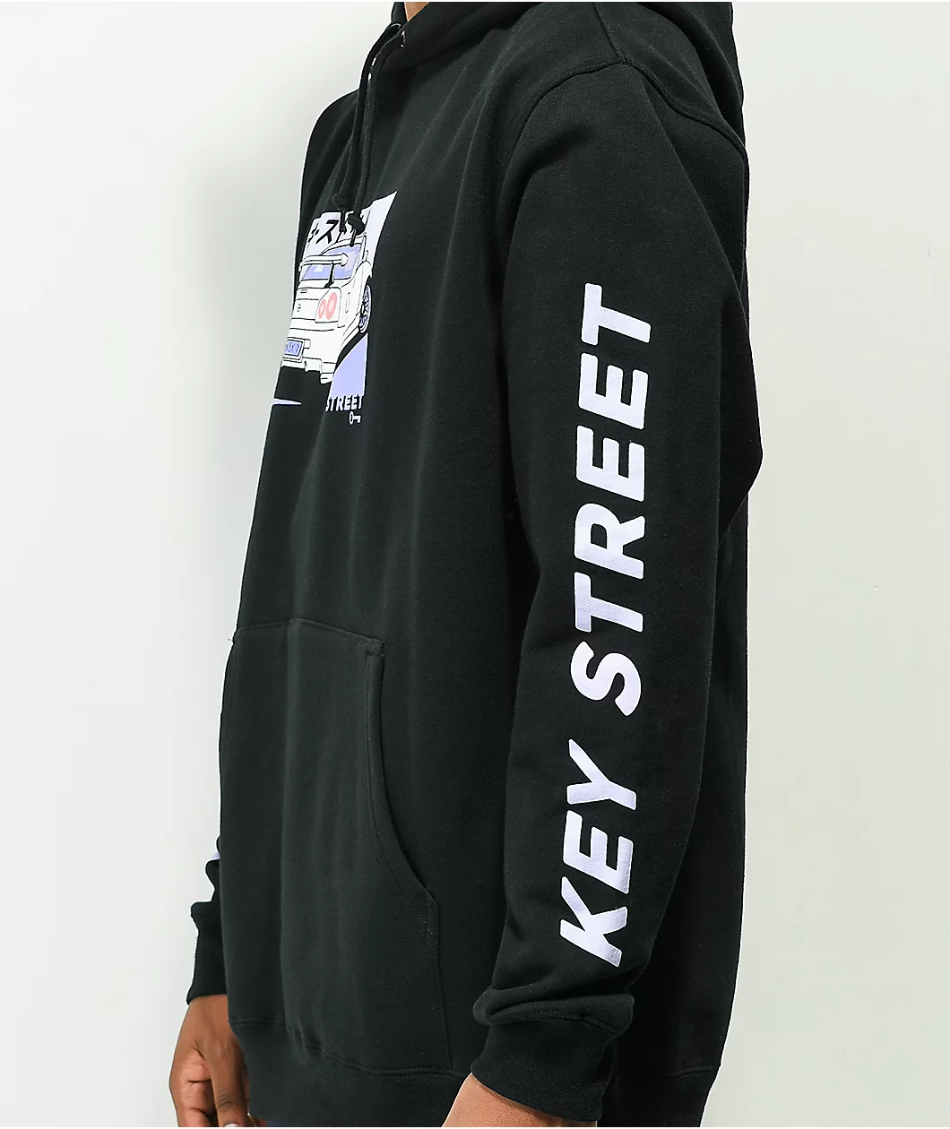 Slide some race-ready steez into your layered looks with Key Street’s Karuma black hoodie! The sweatshirt’s fleece-lined interiors and adjustable hood provide it with plenty of warmth and comfort, while the all-black colorway ensures it’ll easily pair into your wardrobe. Screen-printed graphics of a speedy-looking JDM car adorn the sweatshirt’s front, with additional logo script descending down each sleeve, lending it some slick, gearhead-friendly detailing.