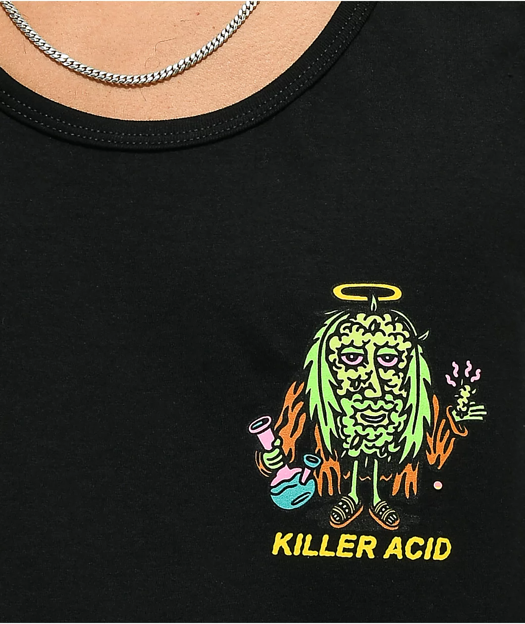 The Jesus Bud tank top from Killer Acid has a scoop neckline, soft cotton construction, and a relaxed, flowy fit. It comes in an always pairable black colorway, with a screen-printed Jesus-infused bud of weed on the left of the chest, and the back bears the same but with this beloved proverb: “Give us this day our daily bud.”