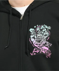 The Killer Hand zip hoodie from Killer Acid x Santa Cruz comes in a black colorway with a screen-printed screaming hand graphic on the left of chest, adorned with various Killer Acid characters. On the back is a collage of Killer Acid and Santa Cruz visuals and characters as well as the brand names flanking the top and bottom. This hoodie has full zip closure, a drawstring-adjustable hood, and two front slash pockets for the utmost convenience and comfort while layering.