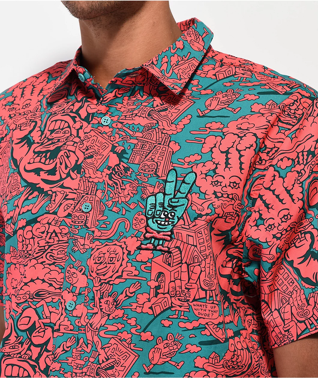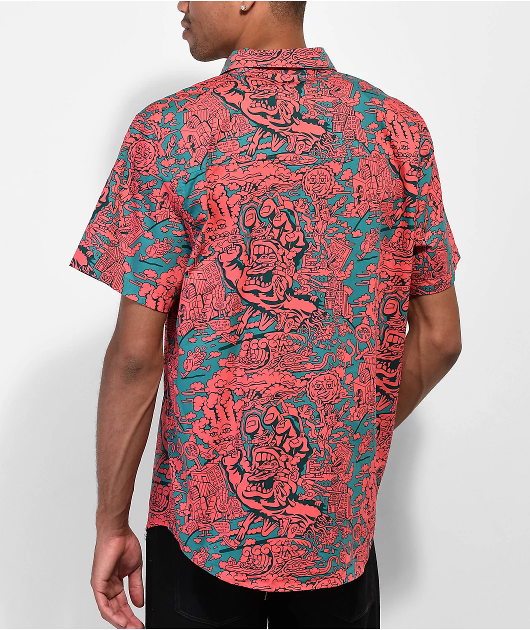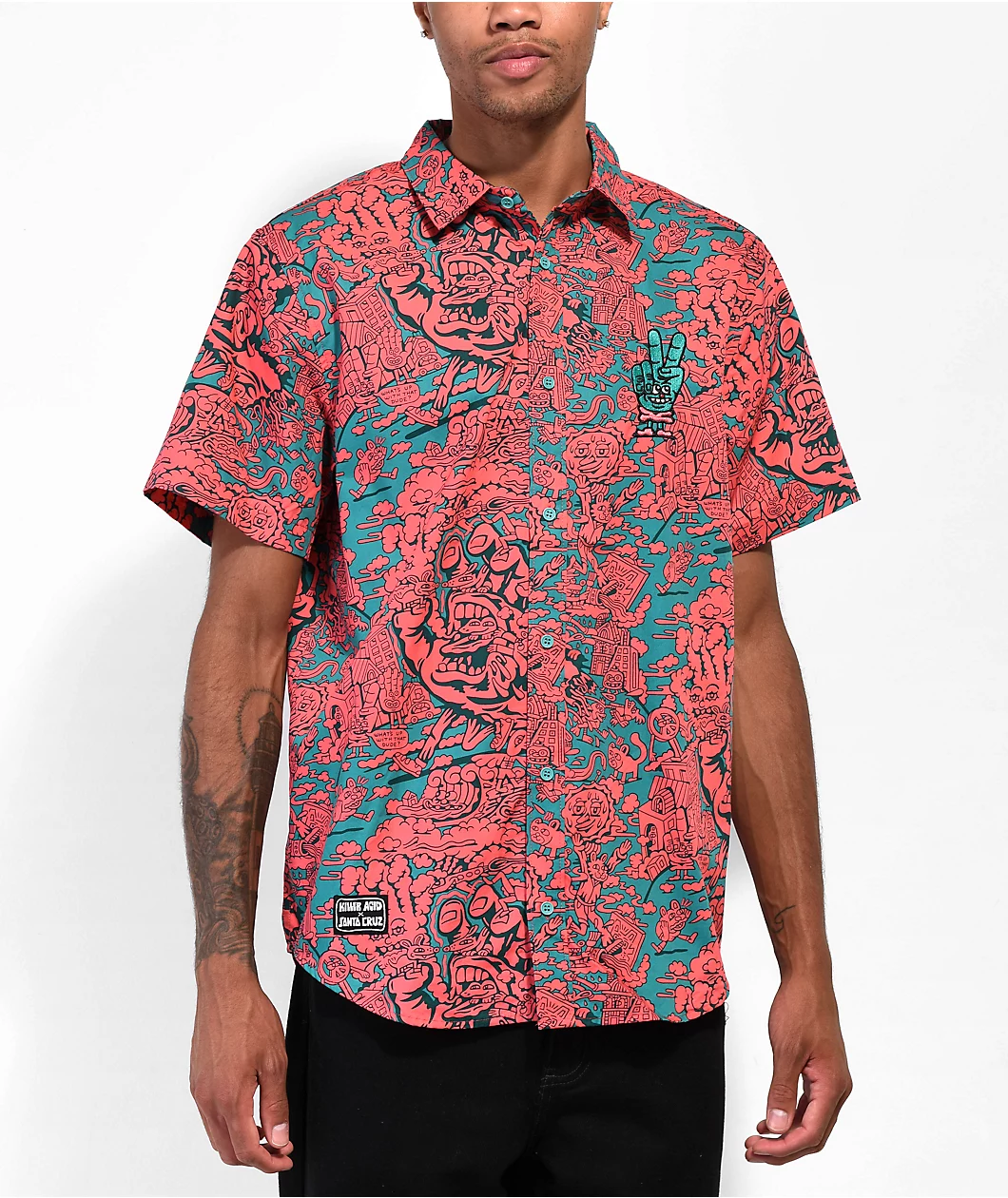 The Peace Hand button up shirt from Killer Acid x Santa Cruz comes in a short sleeve construction with a pink and teal colorway boasting sublimated graphics throughout of various Screaming Hands, as well as a screen-printed smiling, personified hand on the left of chest in a contrasting black colorway. This shirt is made of 100% rayon and features full button-up closure and a classic turndown collar.