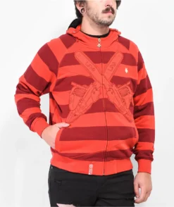 Last released in 2007, the LRG Friday the 47th hoodie returns in a red colorway with a unique removable hockey mask attached to the hood. The sequel to the LRG Dead Serious hoodie features thick red stripes throughout, while an embroidered chainsaw graphic on the chest adds to the slasher film look. With a loose fit, the hoodie is finished with a full zip closure, gold metallic hardware, and a terry-lined interior.