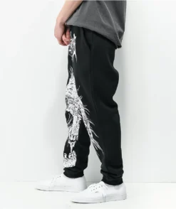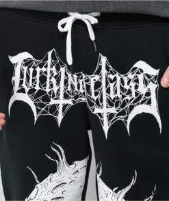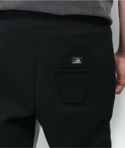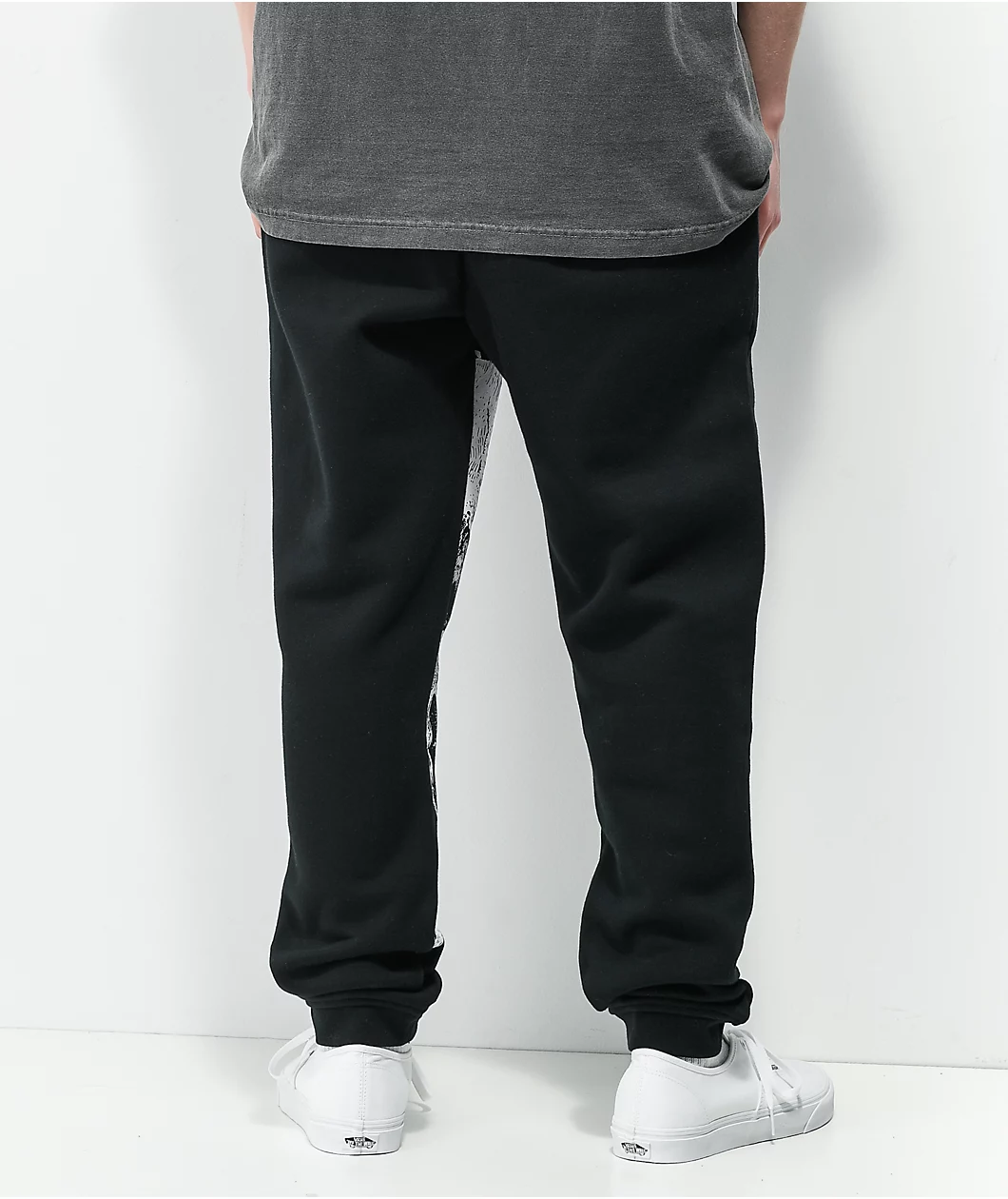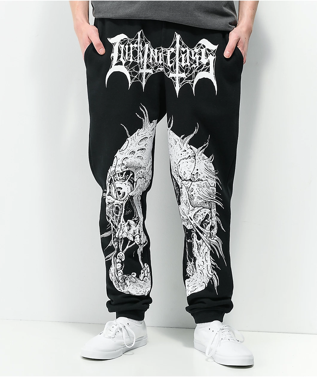 Add Lurking Class by Sketchy Tank’s comfy yet hair-raising Babyface black jogger sweatpants to your collection! These black jogger sweats are constructed from a combination of both cotton and polyester, making them so soft they’re almost otherworldly, while the massive screen-printed spidery Lurking Class script haunts the crotch and a gruesome skull is split evenly down both legs.