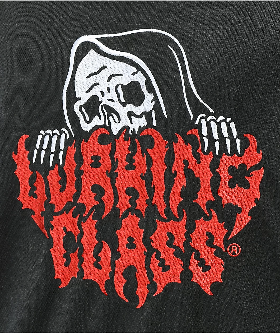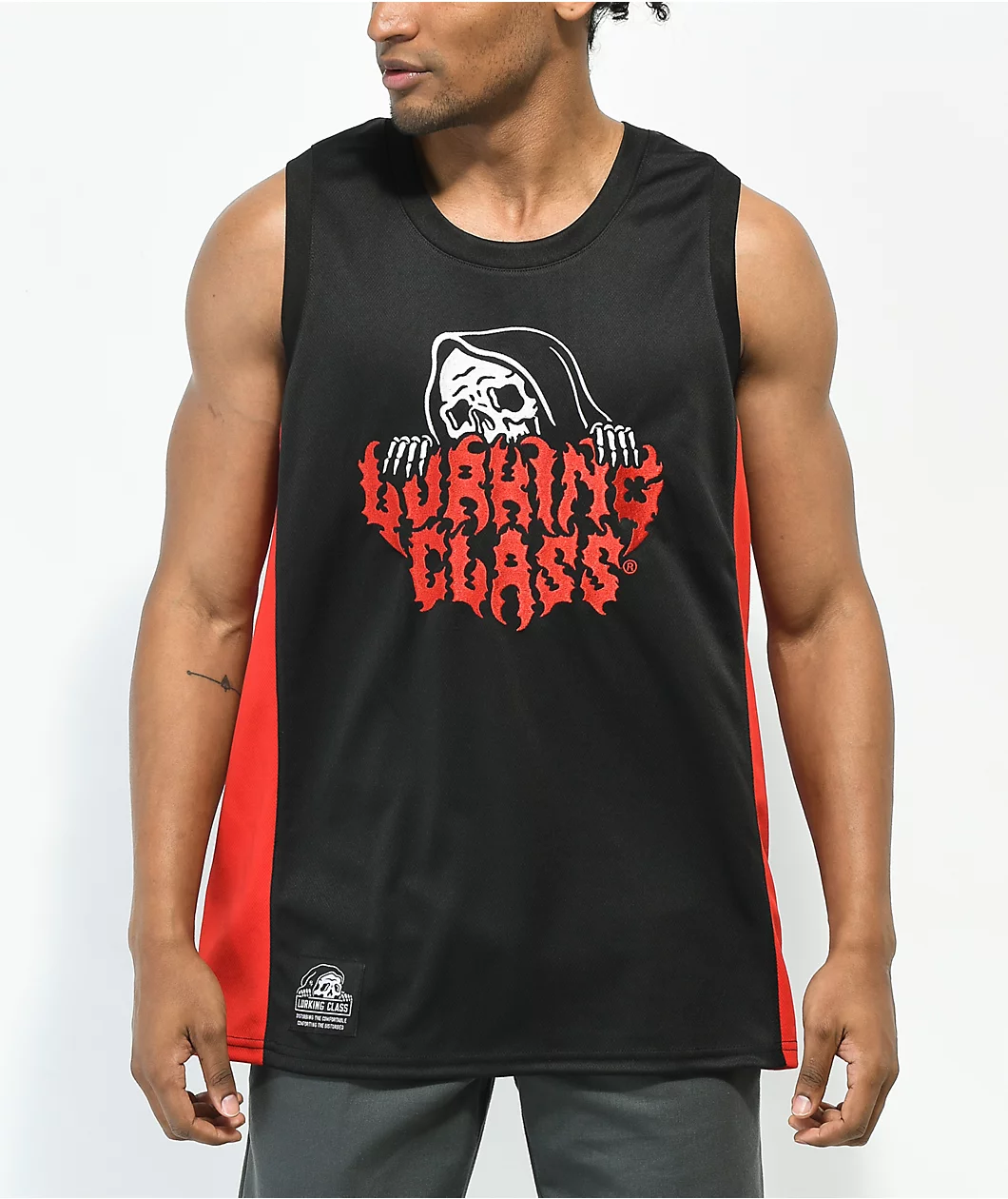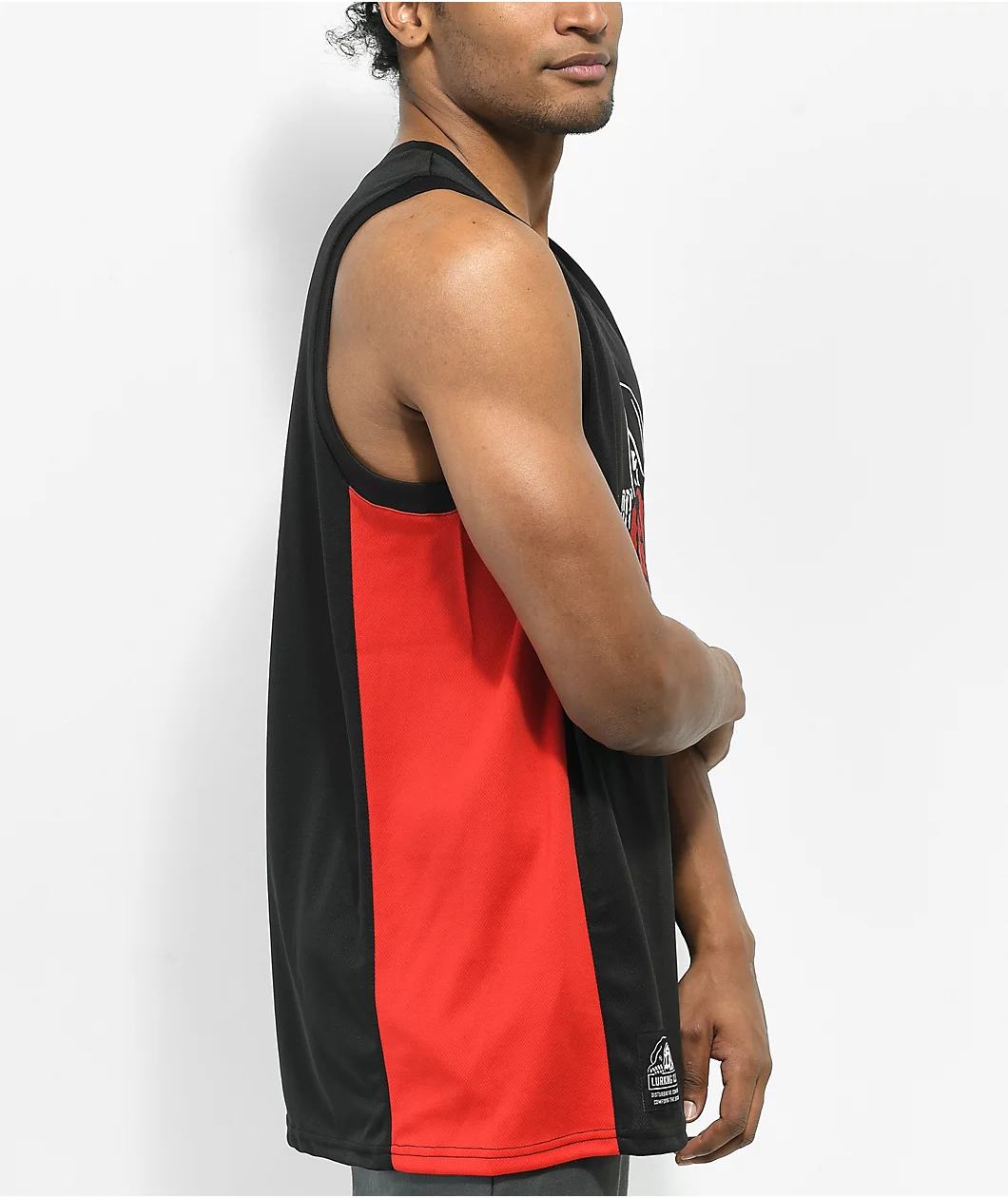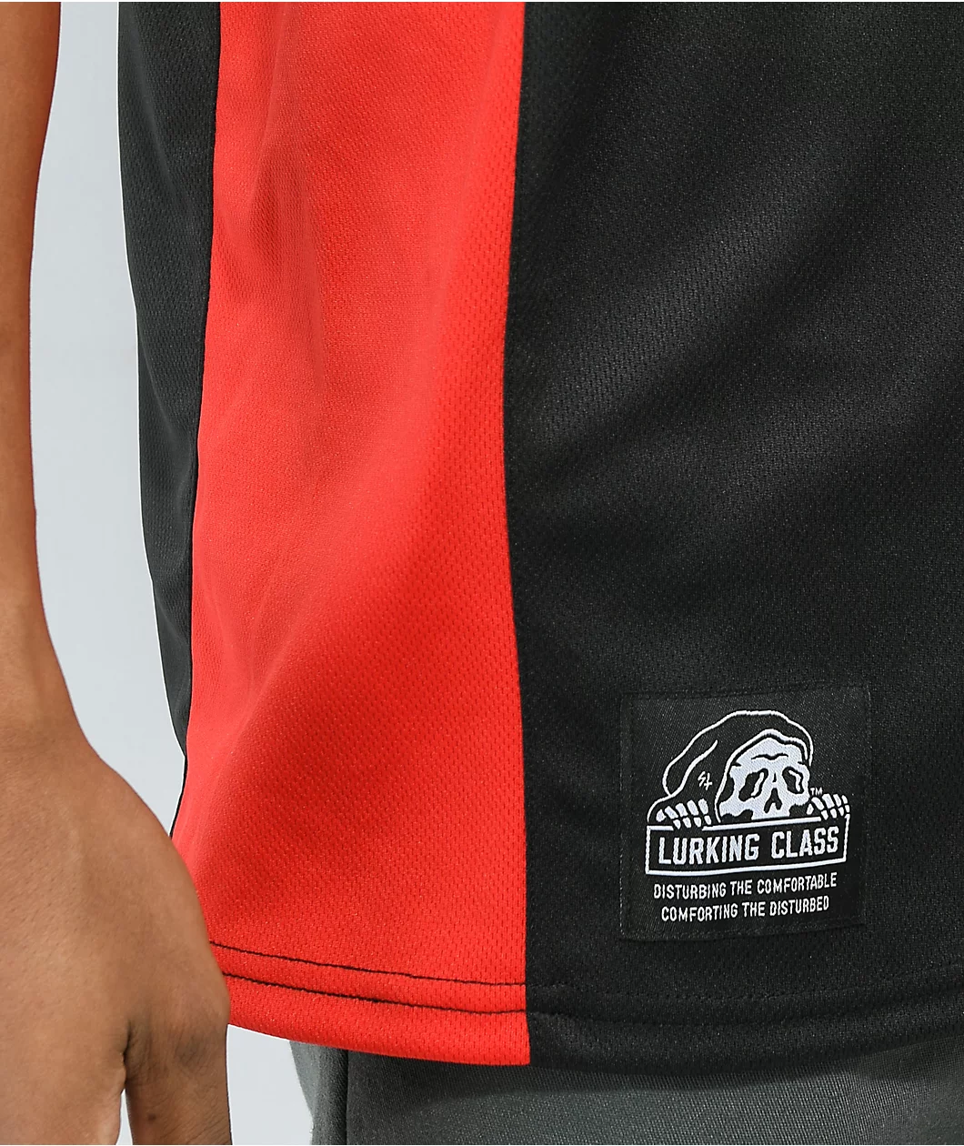 This basketball jersey from Lurking Class by Sketchy Tank comes in a black colorway with accenting red sides and an embroidered graphic on the front of Lurker, the brand’s reaper figure, peeking over script of the brand name. This jersey is made of 100% polyester for a breathable, loose fit and features ribbed hems along the collar and arm openings for a secure and comfortable construction.