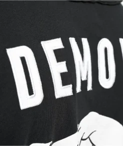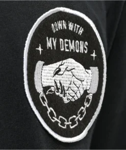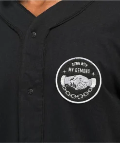 The Demons jersey from Lurking Class by Sketchy Tank has a classic baseball silhouette, and comes in black colorway and soft, midweight, breathable cotton. The Lurking Class jersey has a full button-up closure, a V-neckline, and a slightly rounded bottom. On the left of the chest is a patch reading, “Down with my demons,” and the back bears the same but as a combination of embroidery and screen-print, and the sleeve hems are finished off with thickly-embroidery chain links.