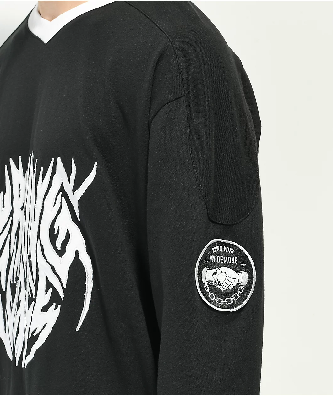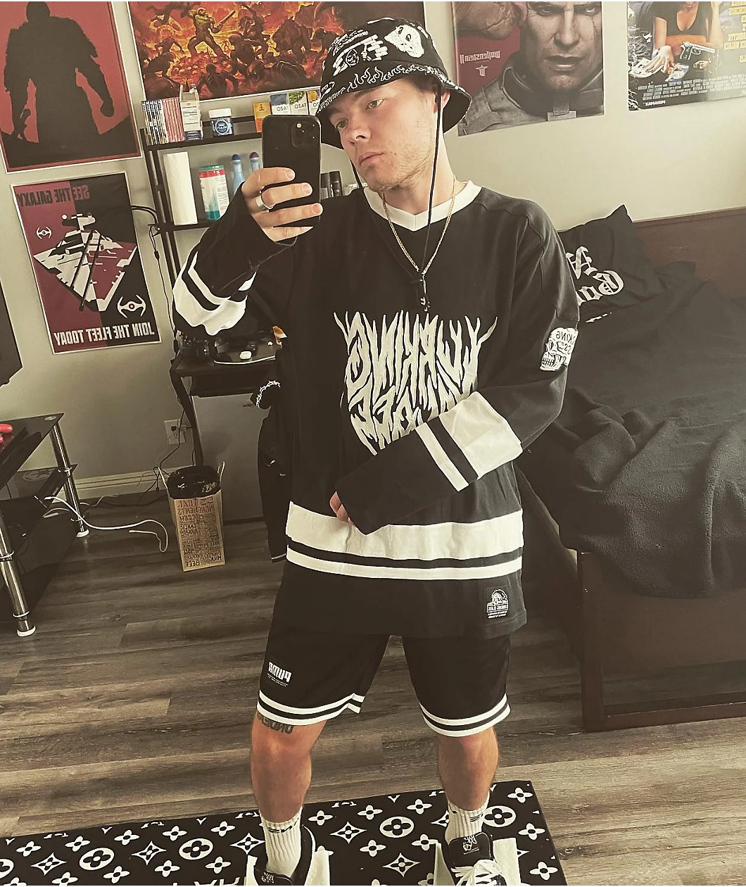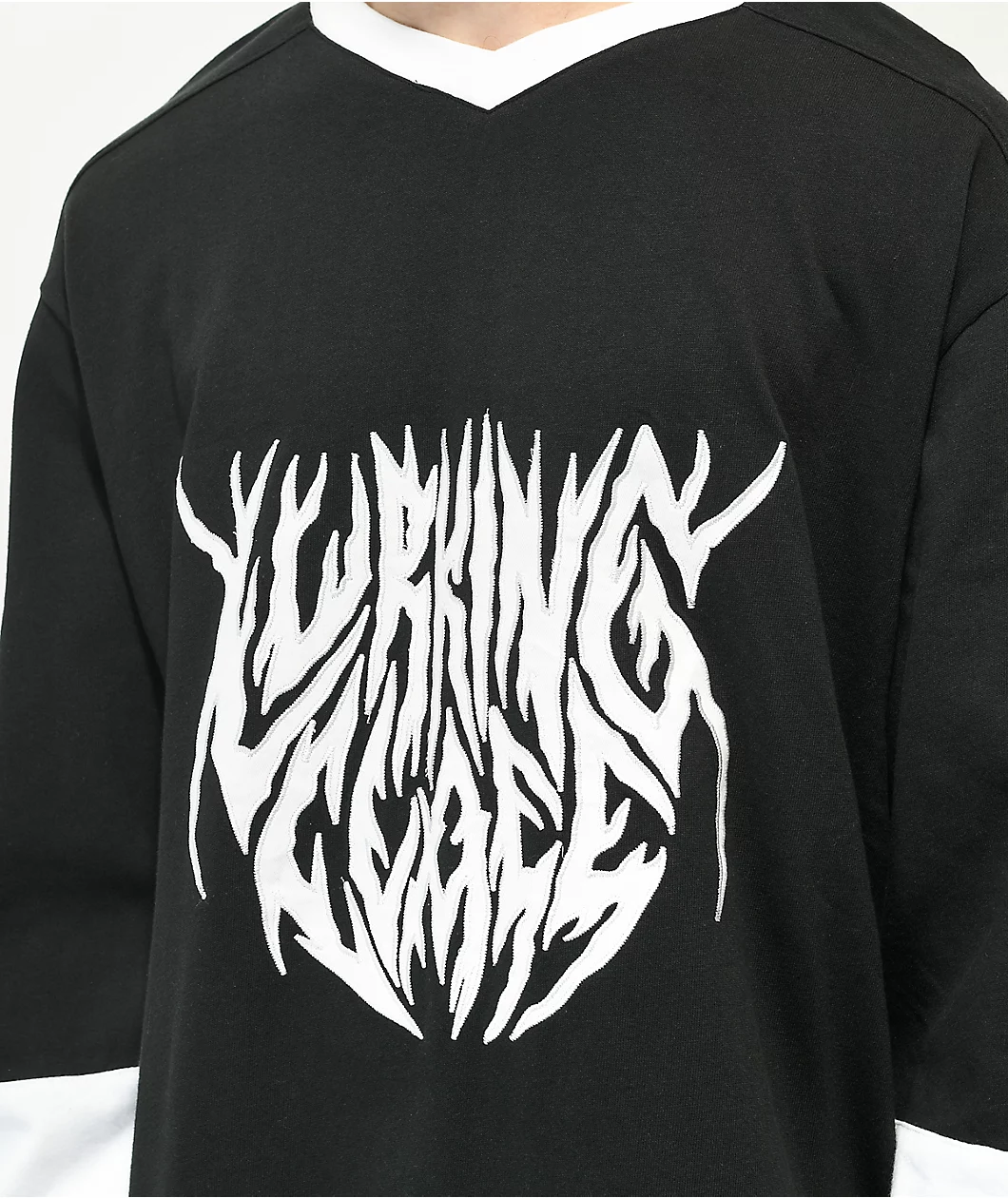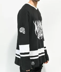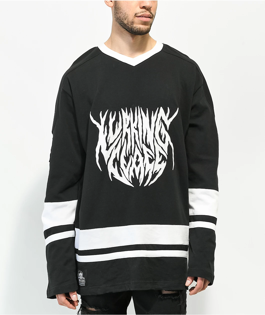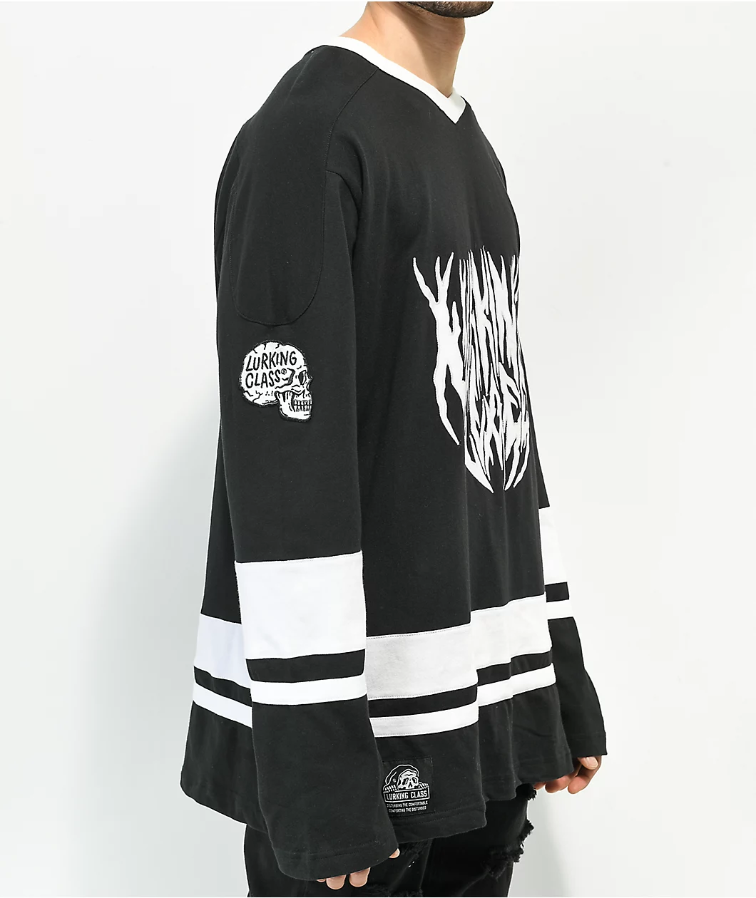 The Lurker Lurking Class by Sketchy Tank hockey jersey comes in a black colorway with white accents throughout and boasts embroidered script on the front of the brand name in a metal-inspired font, a graphic of Lurker peaking over a stripe on the back, and a brand patch on both arms. This jersey features a long sleeve construction made out of a soft, 100% cotton fabrication with a comfortable, relaxed fit.
