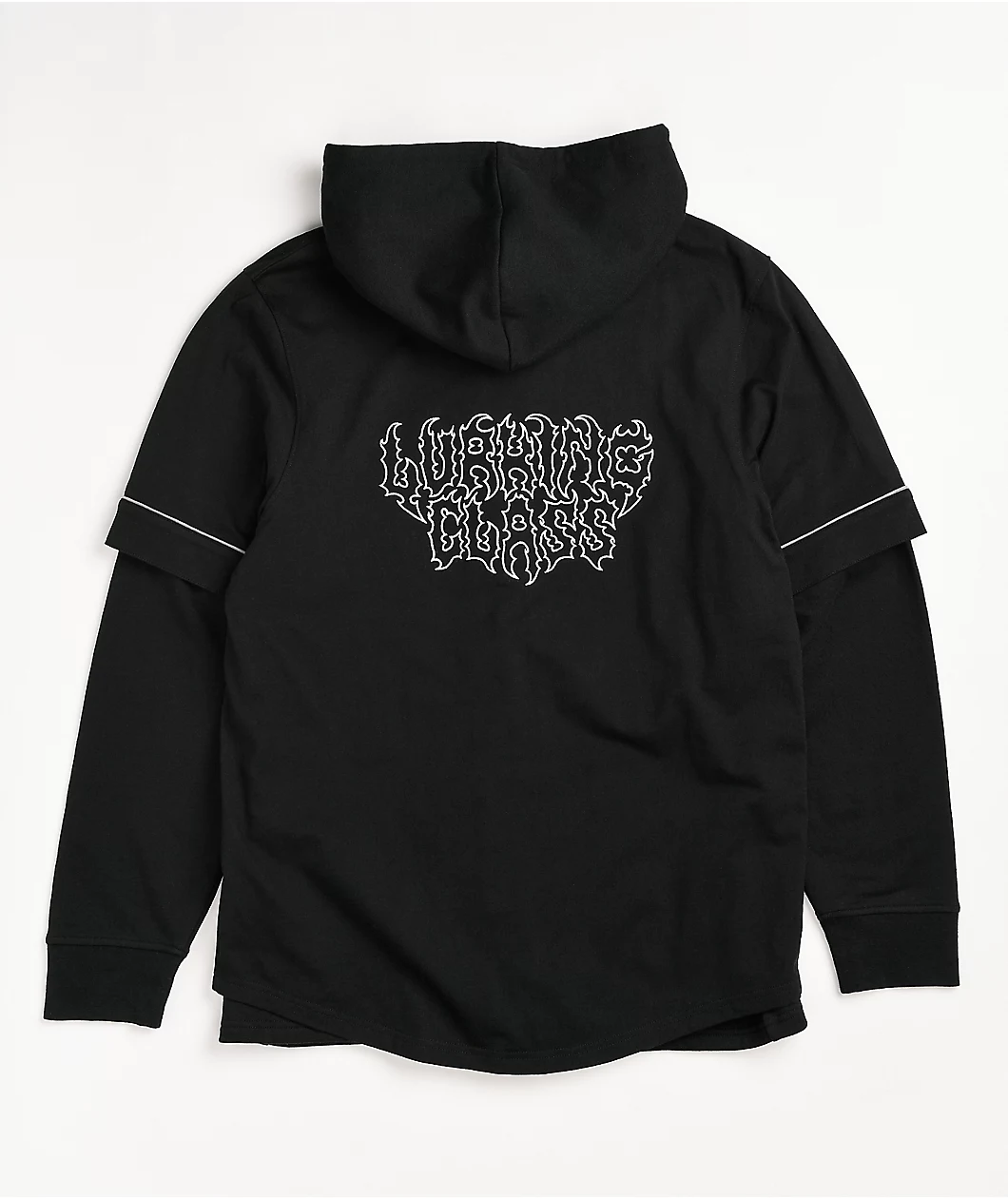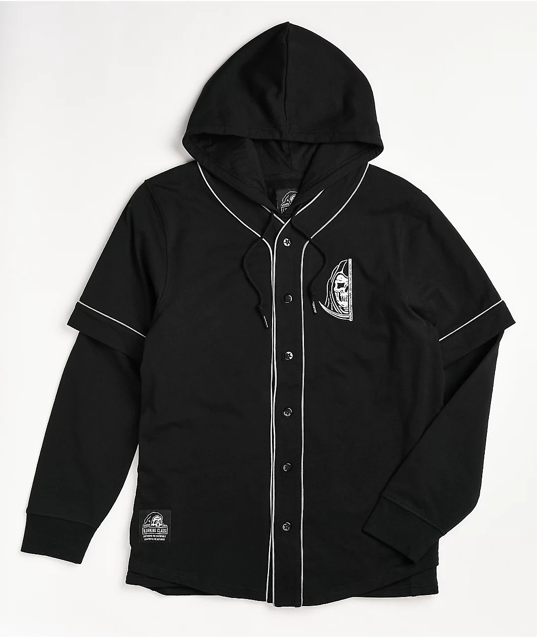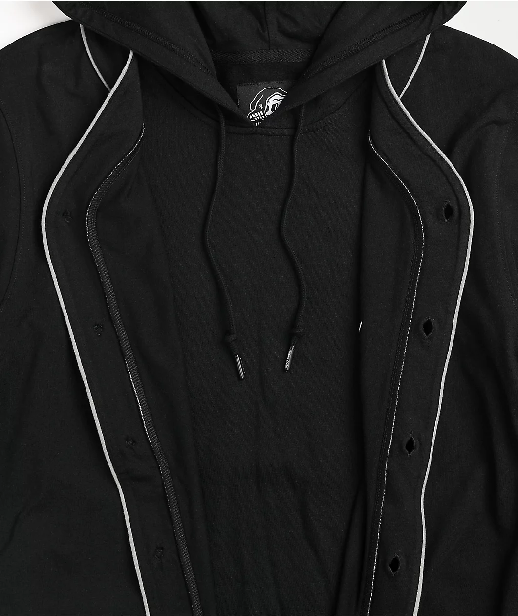 Add a couple fun looks into your arsenal with the Scythe layered black baseball hoodie from Lurking Class by Sketchy Tank! This hoodie features a traditional sweatshirt silhouette with a black baseball jersey overlaid. The Lurking Class script embroidery across the back ensures some killer branding, while the Lurker and scythe graphic at the left chest lends a bit of a macabre look to this awesome jacket.