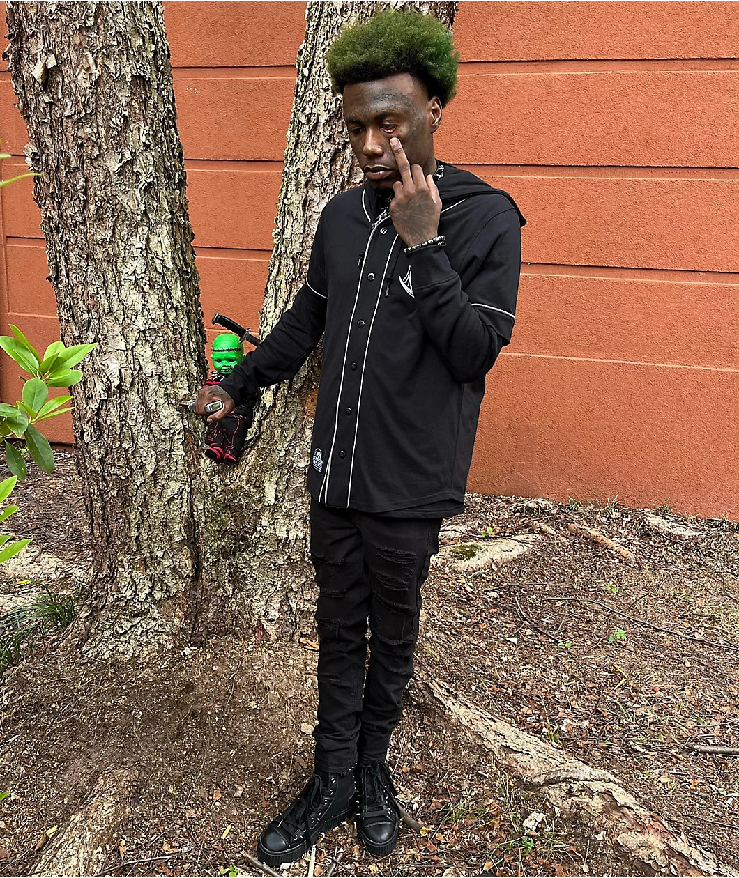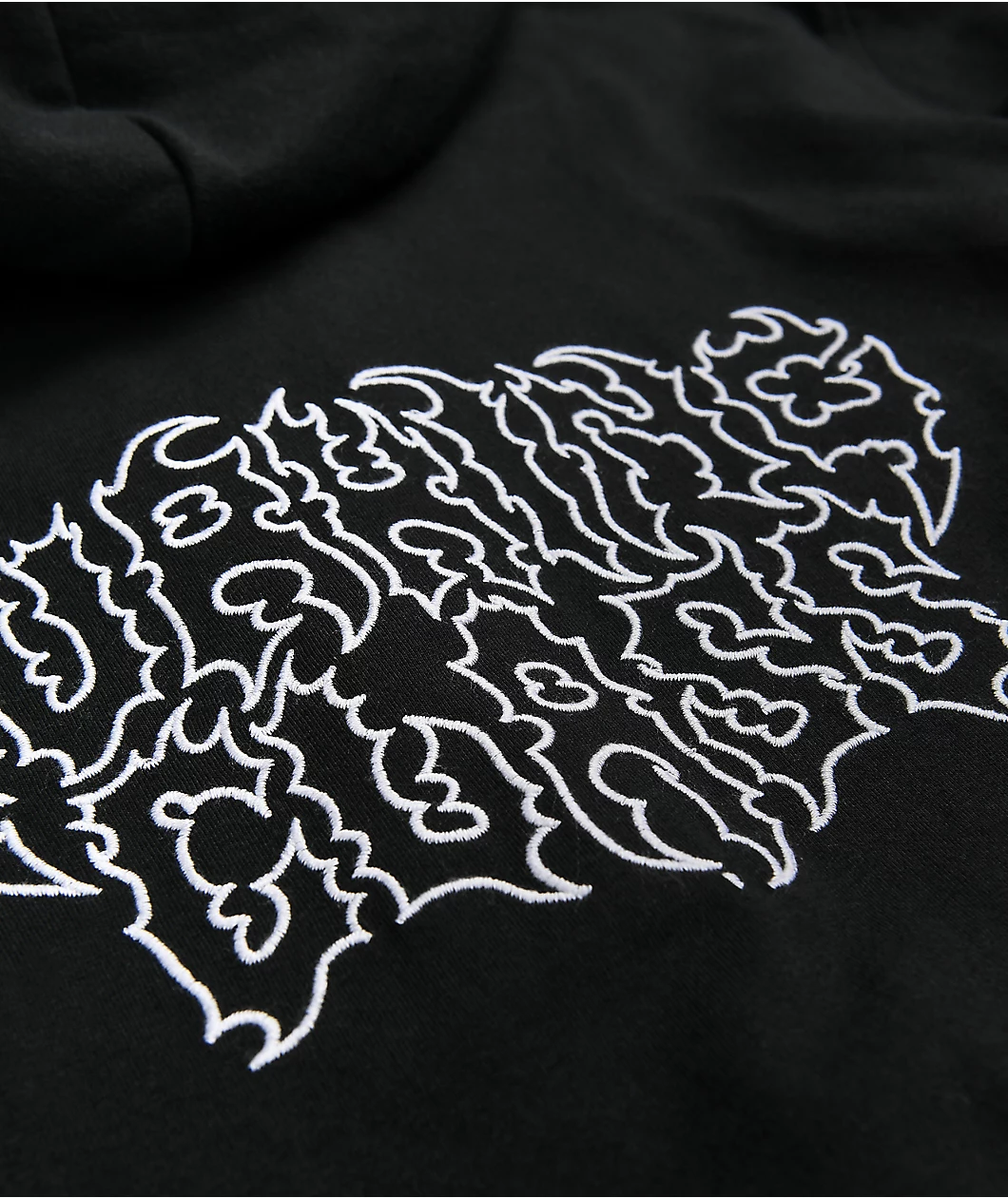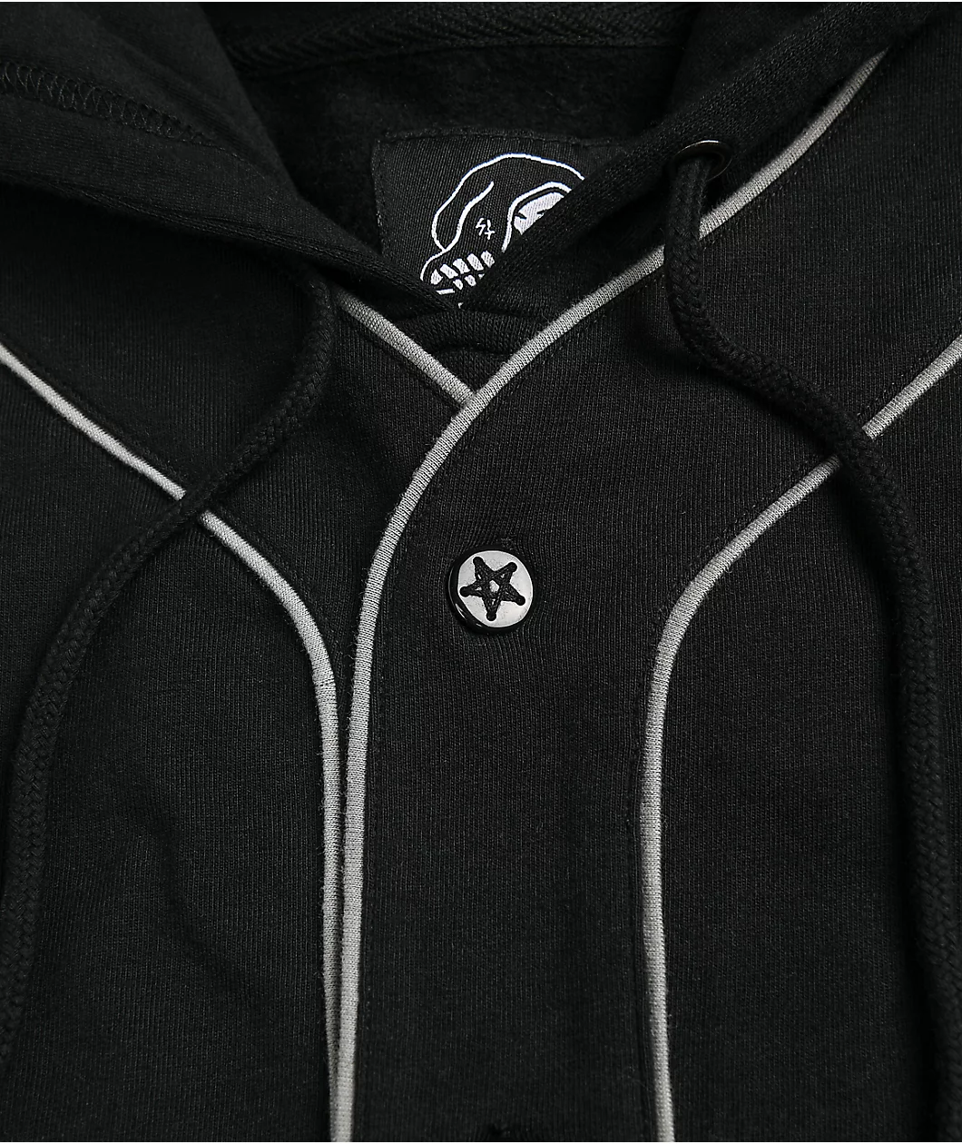Add a couple fun looks into your arsenal with the Scythe layered black baseball hoodie from Lurking Class by Sketchy Tank! This hoodie features a traditional sweatshirt silhouette with a black baseball jersey overlaid. The Lurking Class script embroidery across the back ensures some killer branding, while the Lurker and scythe graphic at the left chest lends a bit of a macabre look to this awesome jacket.