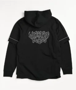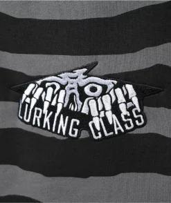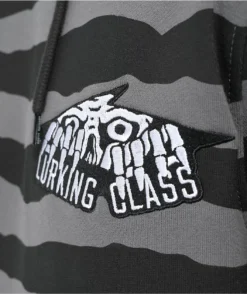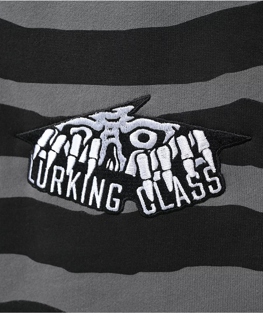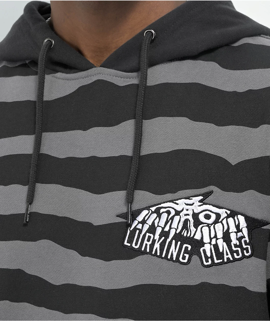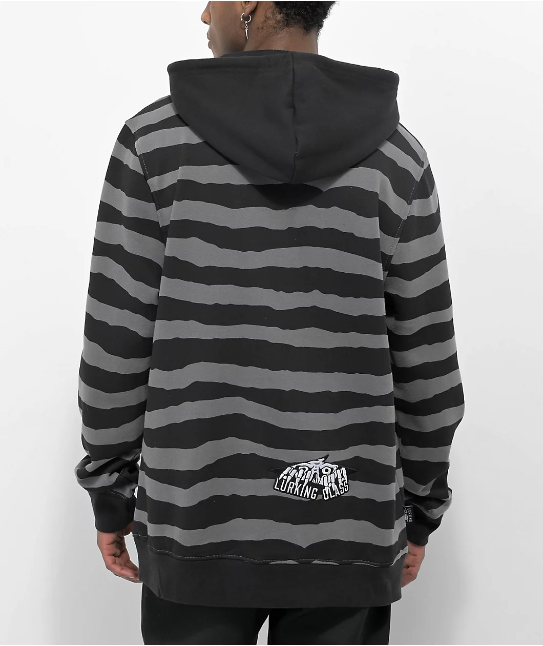 In a black and grey horizontal striped colorway comes the Terror Eyes hoodie from Lurking Class by Sketchy Tank, showing off the lurker in white embroidery left of chest. This hooded sweatshirt offers a snug fit with an adjustable drawstring hood, coming complete with a kangaroo pouch pocket for storage.