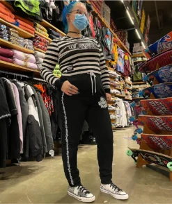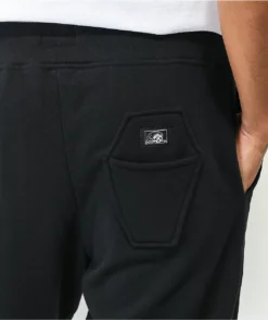 Lurking Class by Sketchy Tank’s Thorns jogger sweatpants come in a sleek all-black colorway and are made from an irresistible blend of cotton and polyester. They have two front slash pockets, but also a particularly special coffin-shaped seat pocket haunting the right side. There’s an embroidered Lurker and Lurking Class logo on the left hip, and embroidered barbed wire descending down both legs, as well.