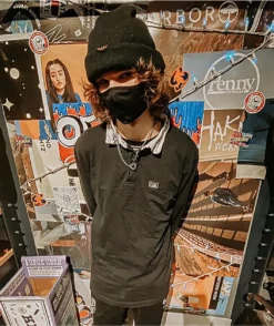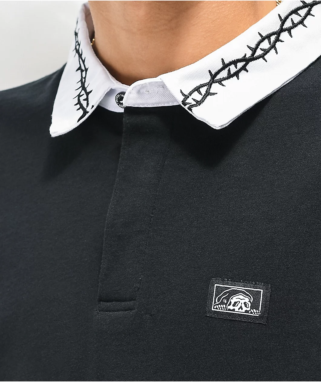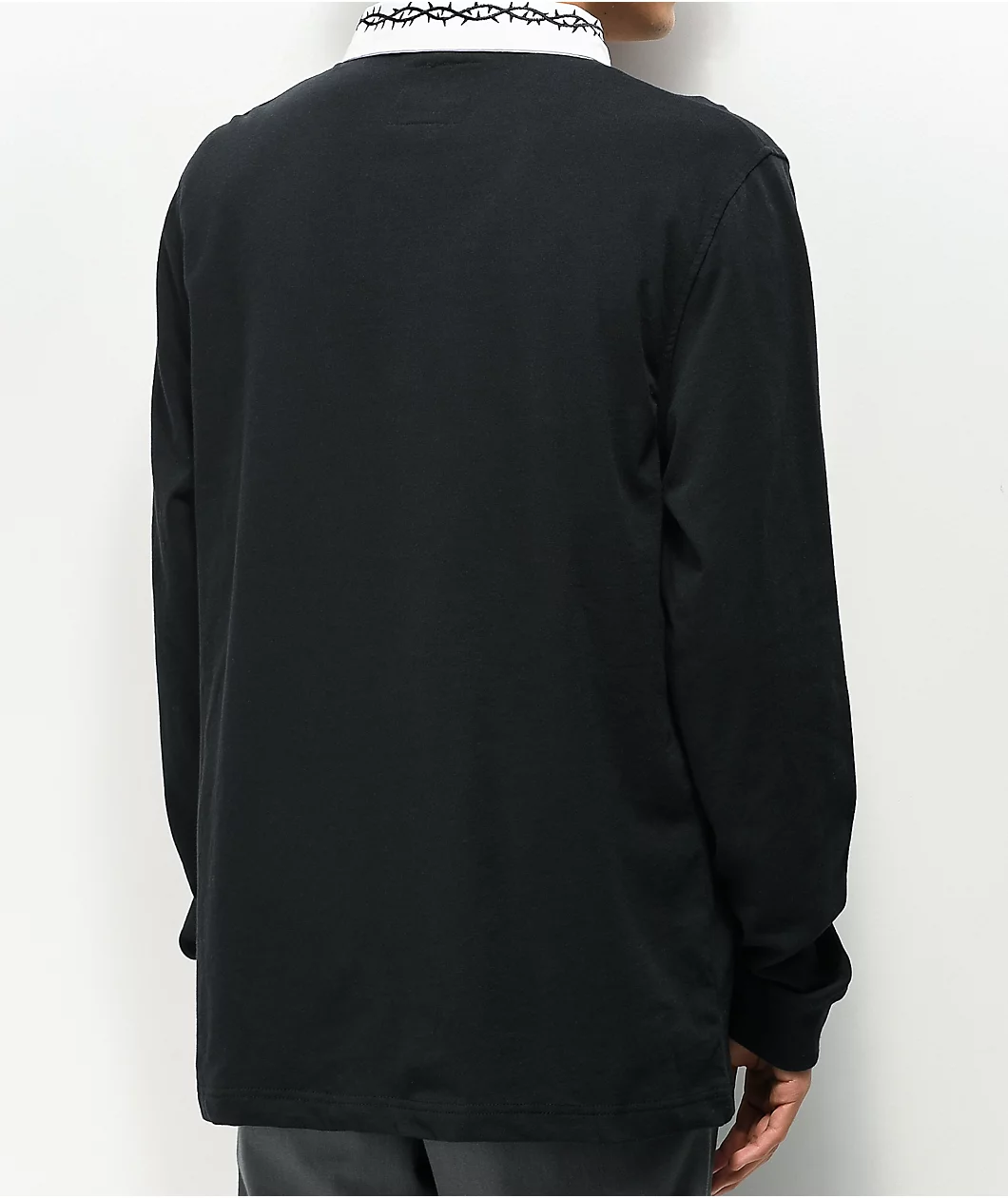 Add a bit of edge to your buttoned-down looks with the Thorns black long sleeve polo shirt from Lurking Class by Sketchy Tank! The traditional white fold-down collar is complemented by a black barbed wire graphic throughout, adding some sick style to the overall look. The striking look is topped off by a woven Lurker tag at the left chest, making this the perfect polo for any wardrobe.