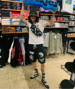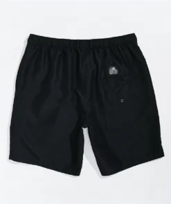 Nothing says leisure quite like the comfy and modernized World Wide 2 black board shorts from Lurking Class by Sketchy Tank. These shorts are made from 100% polyester for a lightweight and fast-drying fit, with mesh-lined front hand pockets, while the back welt pocket is uniquely shaped as a coffin. They also feature a collage of graphics, like a spider web infected Yin Yang symbol and Sketchy Tank script on the left leg, while the right leg bears Lurking Class script and the grim reaper hoisting itself out from the cracked center of a globe.