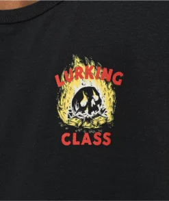 The Trust tank top from Lurking Class by Sketchy Tank x Stikker comes in a black colorway with a graphic of a skull burning over a stack of cash on the left side of the chest as well as a larger graphic on the back depicting the devil and two men in suits collecting money and bones in hell. Located above the graphic is the text, “Trust no suits” and below is the brand name, both in a red flame script.