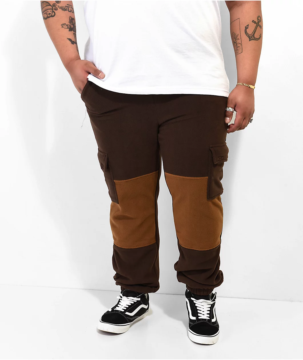 The Cozay cargo pants from Monet are made from a brown micro fleece material, with a cozy relaxed fit. The fleece cargo pants boast cinched bottom hems and an elastic drawstring waistband for a comfortable fit, while light brown color blocked knees and cargo pockets along the thighs add a luxe feel.