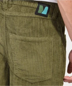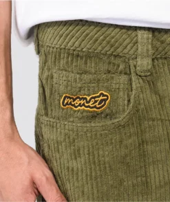 The Push corduroy skate pants from Monet are made of 100% cotton and come in an olive green colorway with a brand patch embroidered on the right hip. These pants feature a classic 5-pocket construction with a drawstring-adjustable waistband and button-and-fly closure.